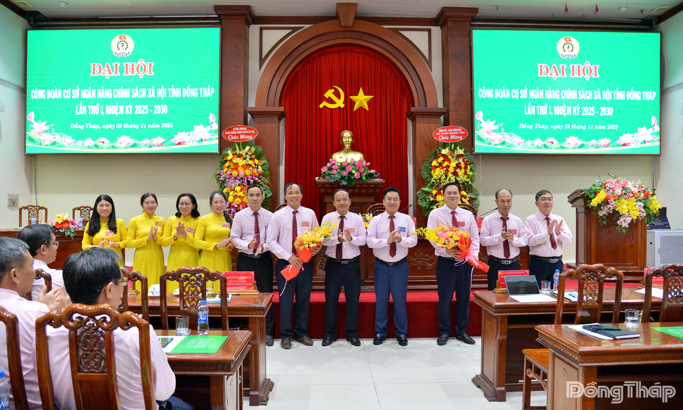 Phó Tổng Giám đốc Ngân hàng Chính sách xã hội Huỳnh Văn Thuận và Giám đốc Chi nhánh Ngân hàng Chính sách xã hội tỉnh Đồng Tháp Dương Văn Hoàng tặng hoa chúc mừng Ban Chấp hành Công đoàn cơ sở Ngân hàng Chính sách xã hội tỉnh Đồng Tháp khóa I, nhiệm kỳ 2025 - 2030.