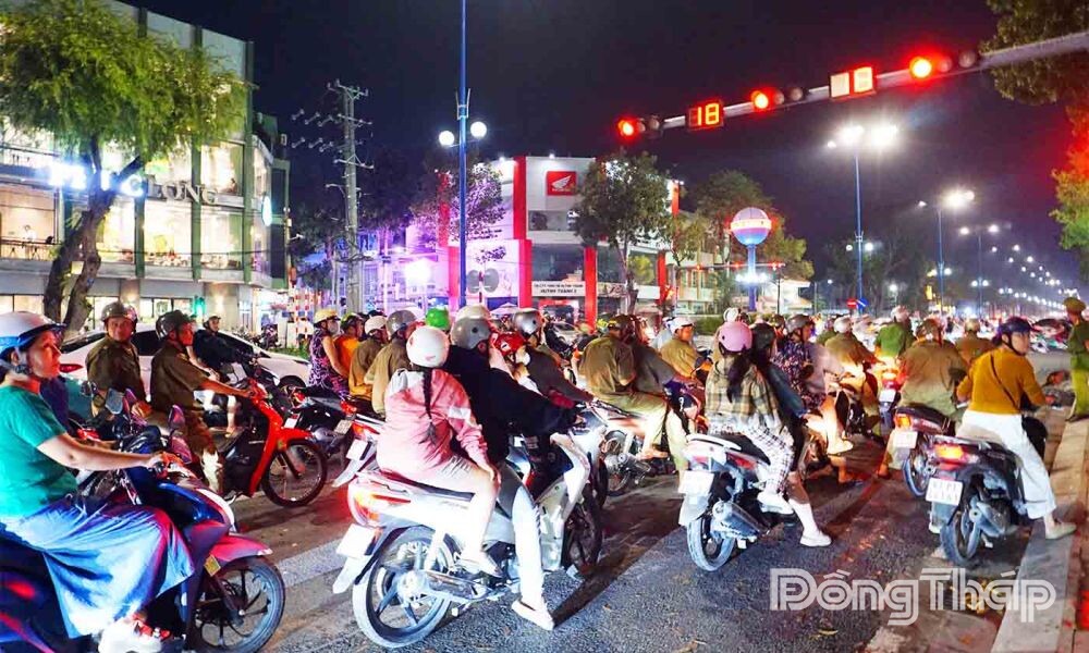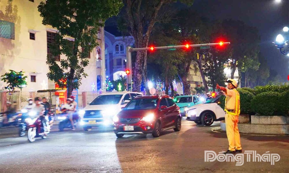 Để đảm bảo an toàn cho người dân tham gia đêm Giáng sinh, Công an tỉnh Đồng Tháp phối hợp với các cơ quan chức năng huy động hàng trăm cán bộ, chiến sĩ cắm chốt tại các điểm, ngã ba, ngã tư để đảm bảo trật tự, an toàn giao thông.