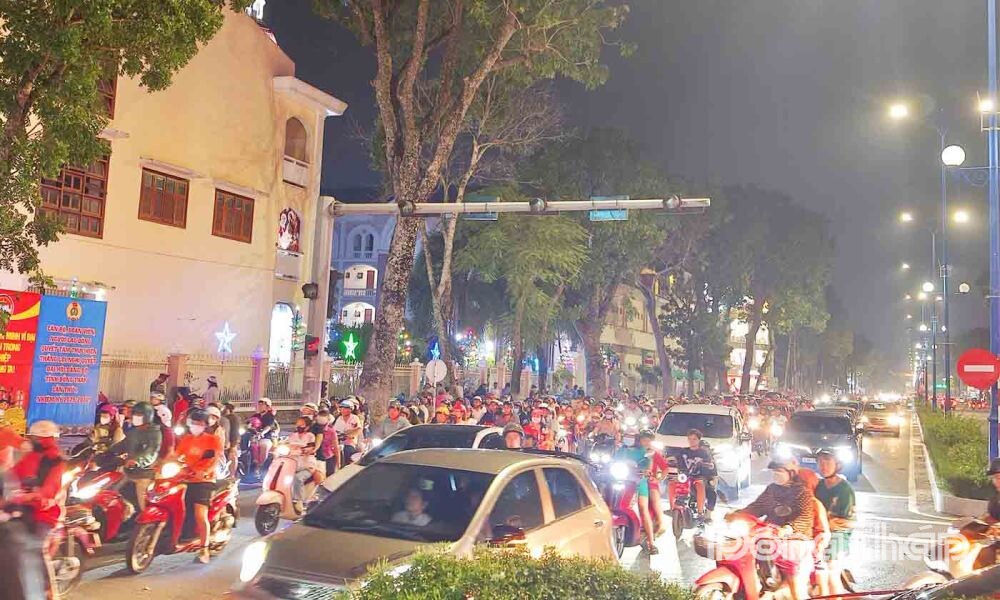 Khắp các con đường, từ đường Hùng Vương, Lý Thường Kiệt, Nguyễn Trãi thuộc các phường Mỹ Tho, Đạo Thạnh…, từng dòng xe tấp nập nối nhau đến các điểm vui chơi, giải trí, nhà thờ.