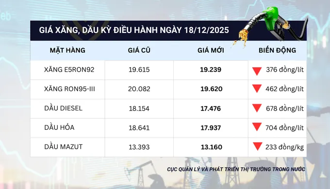Sau khi thực hiện điều chỉnh, kể từ 15 giờ ngày 18-12, giá xăng E5RON92 còn 19.239 đồng/lít (giảm 376 đồng/lít), xăng RON95-III còn 19.620 đồng/lít (giảm 462 đồng/lít), dầu diesel 0.05S còn 17.476 đồng/lít (giảm 678 đồng/lít), dầu hỏa còn 17.937 đồng/lít (giảm 704 đồng/lít) và dầu mazut 180CST 3.5S còn 13.160 đồng/kg (giảm 233 đồng/kg).