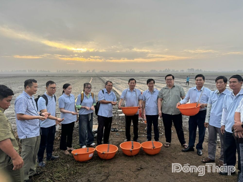 Tại cánh đồng thuộc ô bao số 52, các đại biểu và nông dân trực tiếp xuống ruộng thực hiện thao tác gieo sạ lúa. Tại đây, nông dân cùng nhau trao đổi, chia sẻ kỹ thuật canh tác lúa sinh thái, tập trung vào việc giảm lượng giống, giảm phân bón hóa học và thuốc bảo vệ thực vật, hướng tới quy trình sản xuất sạch, đạt tiêu chuẩn chất lượng cao.