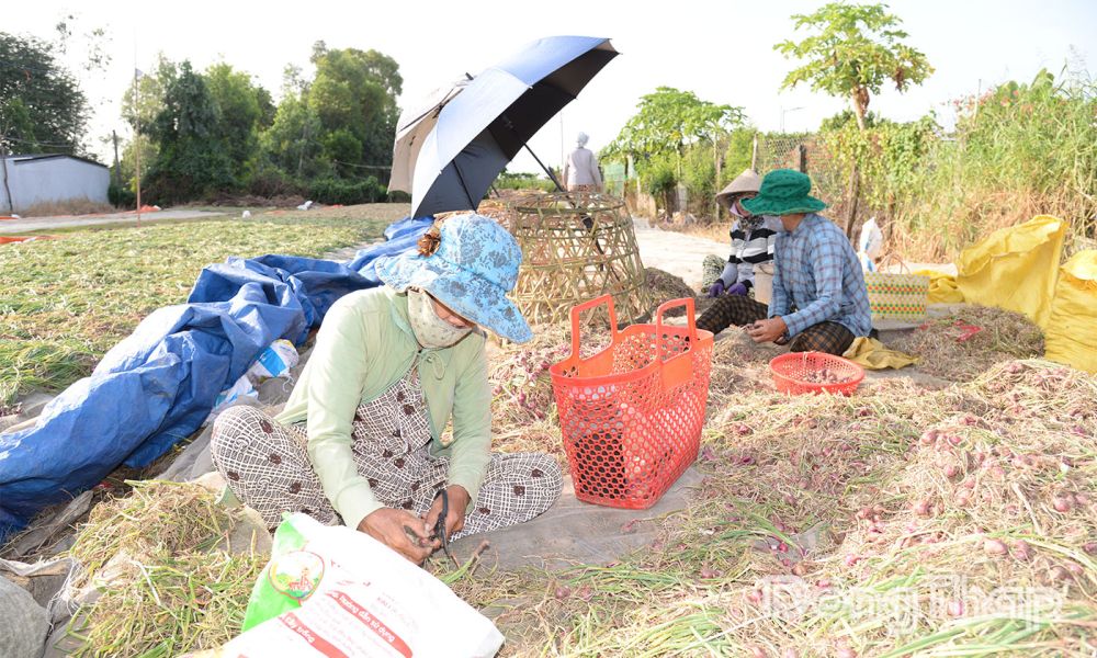 Trong mùa hành tím, nhiều lao động nông thôn, chủ yếu là phụ nữ tại các xã ven biển lại có thêm thu nhập nhờ nghề “ăn theo”. Theo đó, các vựa hành mỗi ngày thuê hàng chục lao động để làm các công việc như nhổ, phơi, sơ chế hành tím…