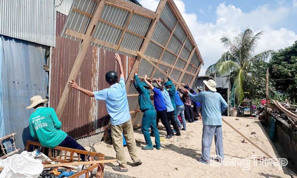 Các thành viên hợp sức, cưa xẻ từng thanh gỗ, chuẩn bị vật liệu để cất nhà cho người dân. Tiếng máy cưa xẻ vang lên, nhịp nhàng, khẩn trương, không chỉ là âm thanh của công việc, mà còn là thanh âm của tình người, của sự sẻ chia nơi mảnh đất cù lao hiền hòa.