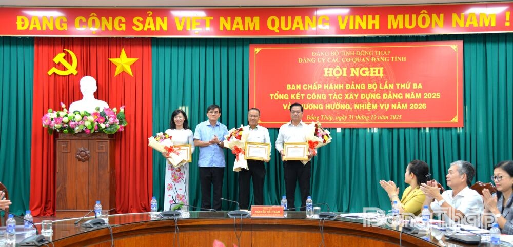 Dịp này, Ban Thường vụ Đảng uỷ các cơ quan Đảng tỉnh trao tặng Giấy khen cho 1 Chi bộ đạt “Hoàn thành xuất sắc nhiệm vụ” tiêu biểu 5 năm liền; 3 đảng viên đạt “Hoàn thành xuất sắc nhiệm vụ” 5 năm liền; 2 tổ chức cơ sở đảng đạt tiêu chuẩn “Hoàn thành xuất sắc nhiệm vụ” tiêu biểu; 2 tổ chức cơ sở đảng có thành tích trong công tác xây dựng Đảng năm 2025.