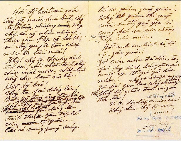 “Bất kỳ đàn ông, đàn bà, bất kỳ người già, người trẻ, không chia tôn giáo, đảng phái, dân tộc. Hễ là người Việt Nam thì phải đứng lên đánh thực dân Pháp để cứu Tổ quốc. Ai có súng dùng súng. Ai có gươm dùng gươm, không có gươm thì dùng cuốc, thuổng, gậy gộc. Ai cũng phải ra sức chống thực dân Pháp cứu nước”.