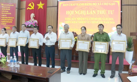 Dịp này, Ban Thường vụ Đảng ủy xã Chợ Gạo khen thưởng 8 tập thể hoàn thành xuất sắc nhiệm vụ tiêu biểu năm 2025.