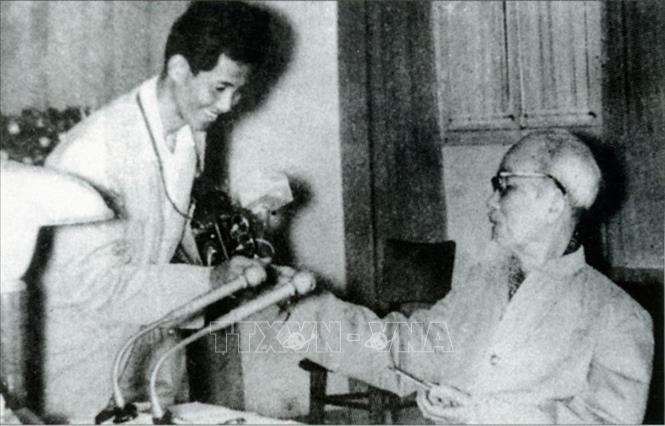 Chủ tịch Hồ Chí Minh tặng thuốc lá thơm cho nhà báo Lâm Hồng Long- tác giả của bức ảnh nổi tiếng "Bác bắt nhịp Bài ca Kết Đoàn. Ảnh: Tư liệu/TTXVN