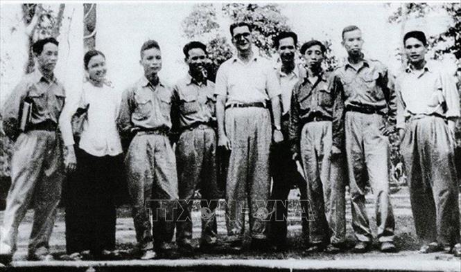 Các nhà báo Việt Nam và quốc tế dự Đại hội lần thứ nhất Hội Những người viết báo Việt (nay là Hội Nhà báo Việt Nam), tại xóm Roòng Khoa, xã Điềm Mặc, huyện Định Hóa (Thái Nguyên), ngày 21/4/1950. Ảnh: Tư liệu/TTXVN phát