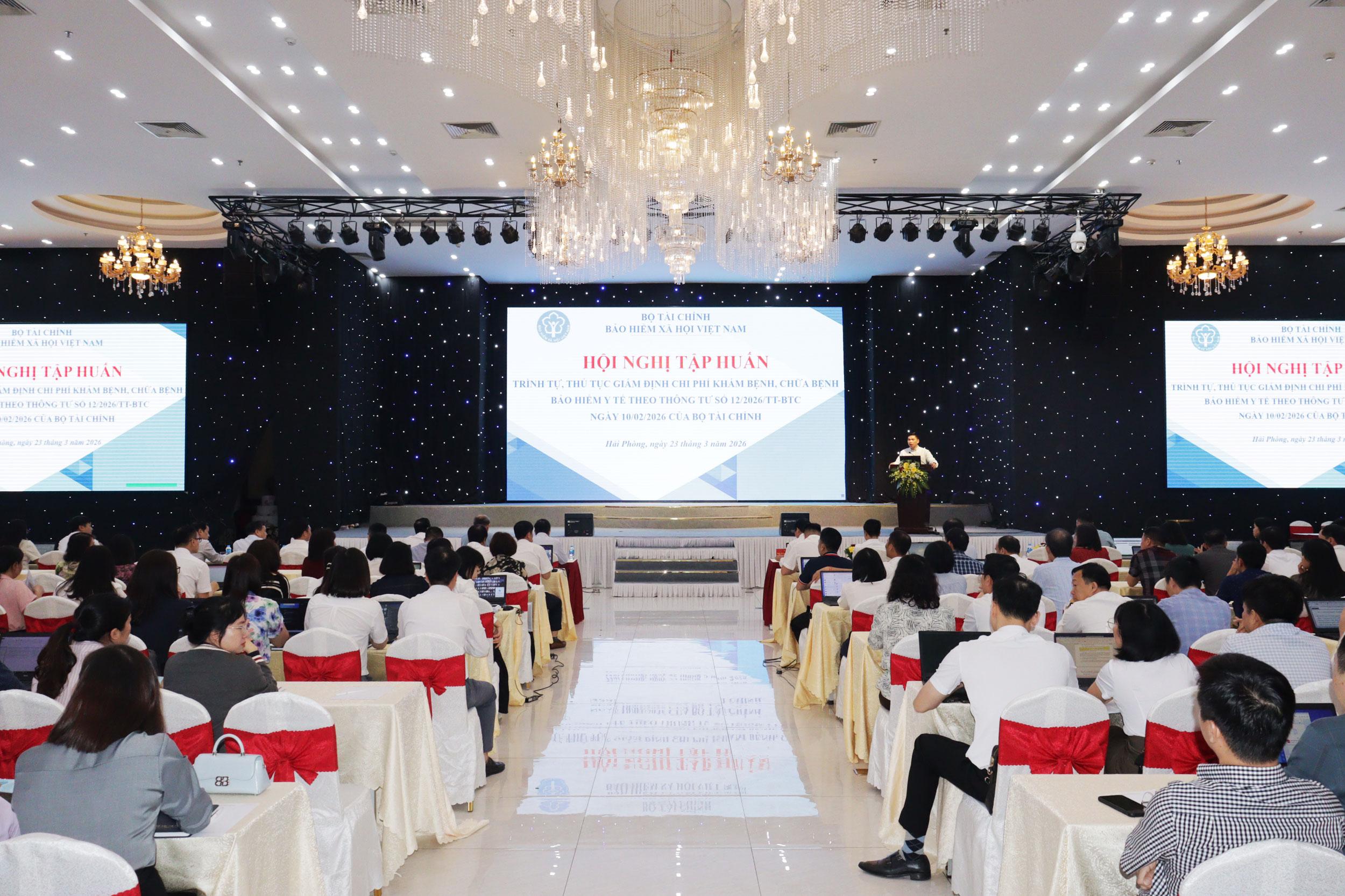 (Haiphong.gov.vn) - Sáng 23/3, tại Hải Phòng, Bảo hiểm xã hội Việt Nam tổ chức Hội nghị tập huấn trình tự, thủ tục giám định chi phí khám bệnh, chữa bệnh bảo hiểm y tế theo Thông tư số 12/2026/TT-BTC ngày 10/02/2026 của Bộ Tài chính.
