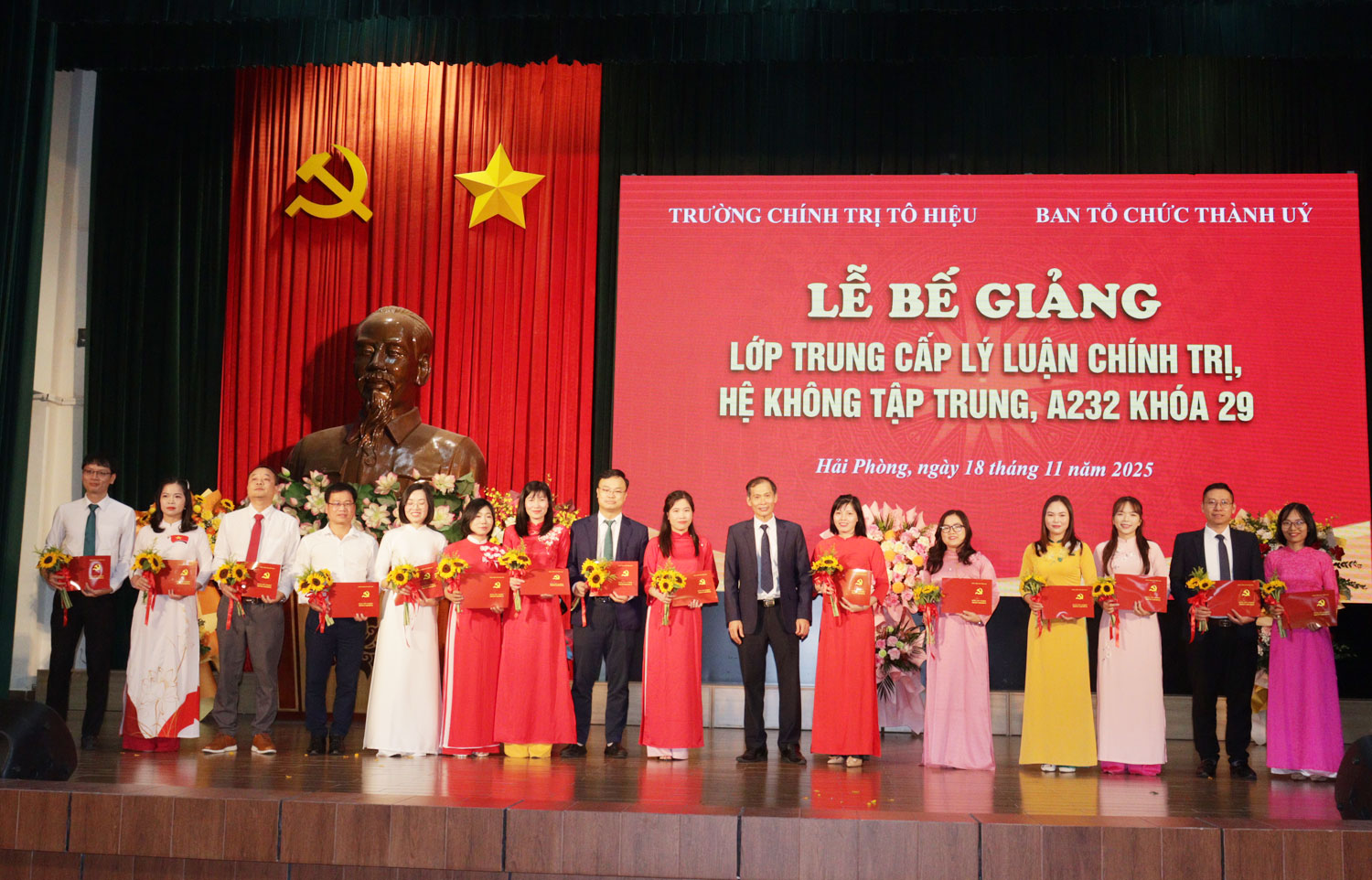(Haiphong.gov.vn) - Chiều 18/11, Trường Chính trị Tô Hiệu phối hợp với Ban Tổ chức Thành ủy tổ chức Lễ bế giảng lớp Trung cấp lý luận chính trị, hệ không tập trung, A232 khóa 29, lớp học tổ chức tại cơ sở 2, phường Thành Đông. Dự Lễ bế giảng có đồng chí Nguyễn Văn Phú, Ủy viên Ban Thường vụ Thành ủy, Hiệu trưởng Trường Chính trị Tô Hiệu; Trương Đức San, Phó Trưởng Ban Tổ chức Thành ủy.