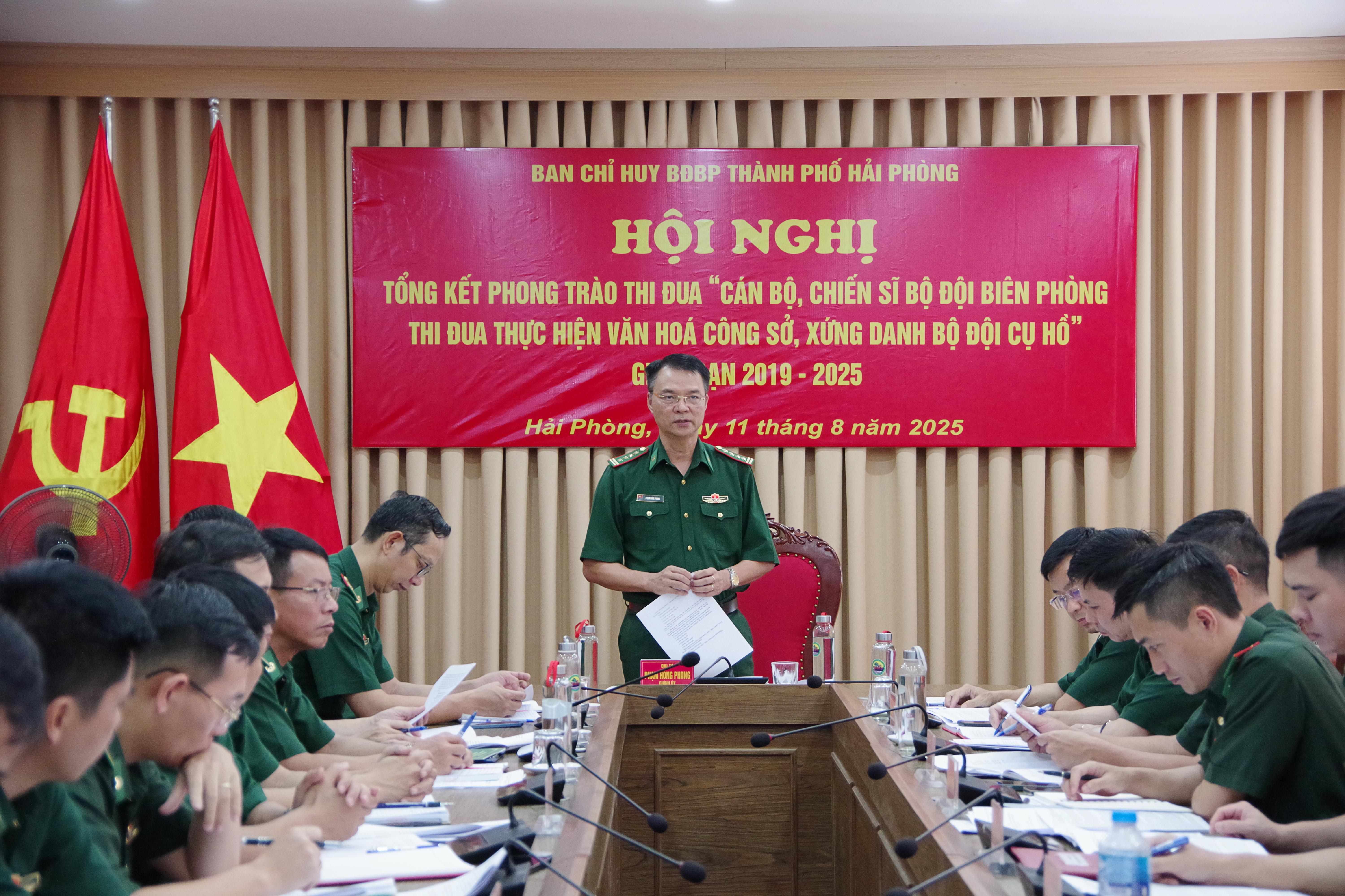 (Haiphong.gov.vn) - Chiều 11/8, Ban Chỉ huy Bộ đội Biên phòng (BĐBP) Hải Phòng tổ chức Hội nghị tổng kết phong trào thi đua “Cán bộ, chiến sĩ Bộ đội Biên phòng thi đua thực hiện văn hóa công sở, xứng danh Bộ đội Cụ Hồ” giai đoạn 2019-2025. Đại tá Phạm Hồng Phong, Bí thư Đảng uỷ, Chính uỷ Ban Chỉ huy BĐBP thành phố chủ trì Hội nghị.