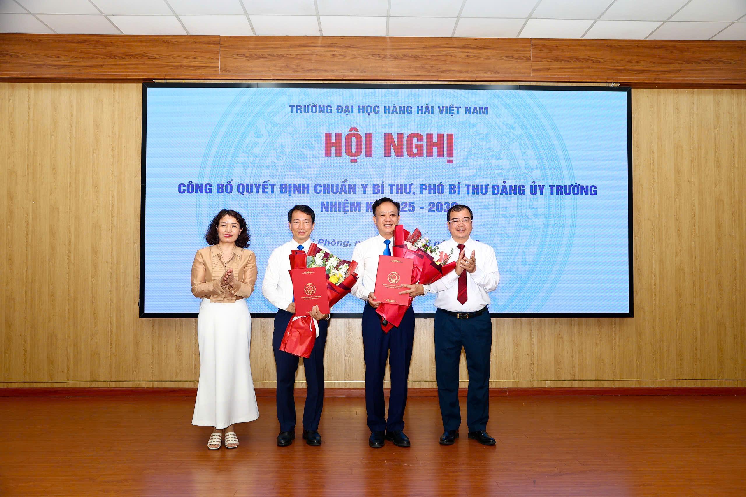 Hội nghị đã công bố các Quyết định của Đảng ủy UBND thành phố về việc chuẩn y đồng chí Phạm Xuân Dương, Hiệu trưởng Trường Đại học Hàng hải Việt Nam giữ chức Bí thư Đảng ủy Trường Đại học Hàng hải Việt Nam, nhiệm kỳ 2025 – 2030; chuẩn y đồng chí Nguyễn Thanh Sơn, Phó Hiệu trưởng Thường trực Trường Đại học Hàng hải Việt Nam giữ chức Phó Bí thư Đảng ủy Trường Đại học Hàng hải Việt Nam, nhiệm kỳ 2025 - 2030.