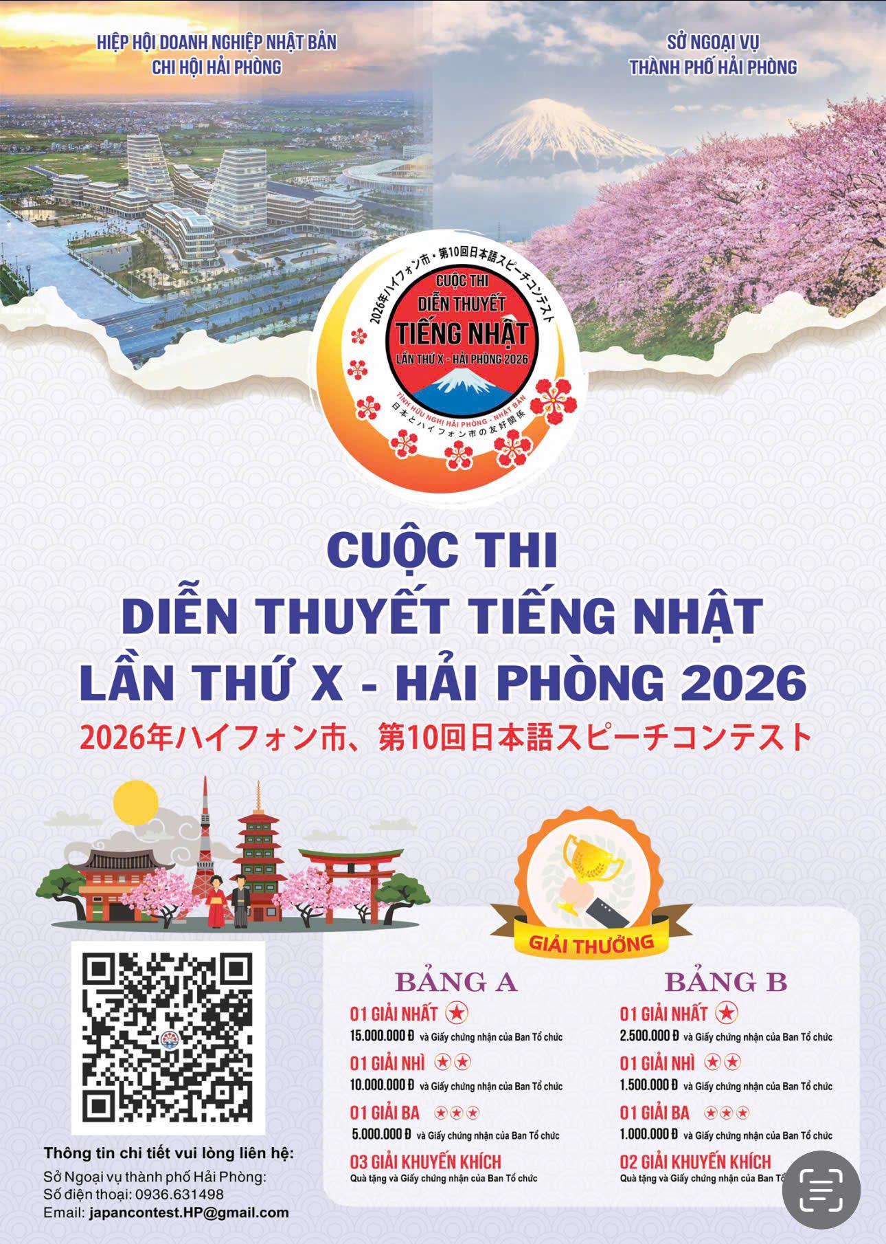 (Haiphong.gov.vn) – Nhằm tạo sân chơi bổ ích cho những người yêu thích ngôn ngữ và văn hóa xứ sở Hoa anh đào, Ban Tổ chức Cuộc thi Diễn thuyết tiếng Nhật lần thứ X – Hải Phòng (gồm: Hiệp hội Doanh nghiệp Nhật Ban - Chi hội Hải Phòng và Sở Ngoại vụ) chính thức Thông báo tuyển chọn thí sinh tham dự cuộc thi năm 2026. Đây là cột mốc ý nghĩa đánh dấu hành trình 10 năm tổ chức, góp phần thúc đẩy mối quan hệ hữu nghị và hiểu biết lẫn nhau giữa nhân dân thành phố Cảng và Nhật Bản.