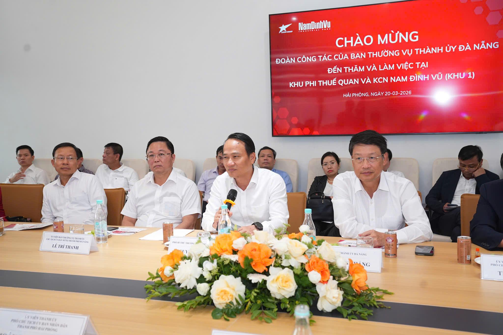 Phát biểu tại cuộc làm việc, đồng chí Lê Ngọc Quang, Bí thư Thành ủy Đà Nẵng đánh giá cao sự phát triển nhanh, toàn diện của thành phố Hải Phòng trong thời gian qua, nhất là trong phát triển công nghiệp, hạ tầng kinh tế và thu hút đầu tư. Sau khi trực tiếp khảo sát một số công trình, dự án, đồng chí Bí thư Thành ủy Đà Nẵng cho rằng, Hải Phòng có nhiều mô hình, cách làm hiệu quả cao mà Đà Nẵng có thể nghiên cứu, học tập. Đà Nẵng cũng đang nỗ lực thúc đẩy tăng trưởng, hướng tới mục tiêu phát triển bền vững, do đó đồng chí Bí thư Thành ủy Đà Nẵng mong muốn 2 địa phương tiếp tục tăng cường trao đổi, phối hợp chặt chẽ hơn ở những lĩnh vực thế mạnh.
