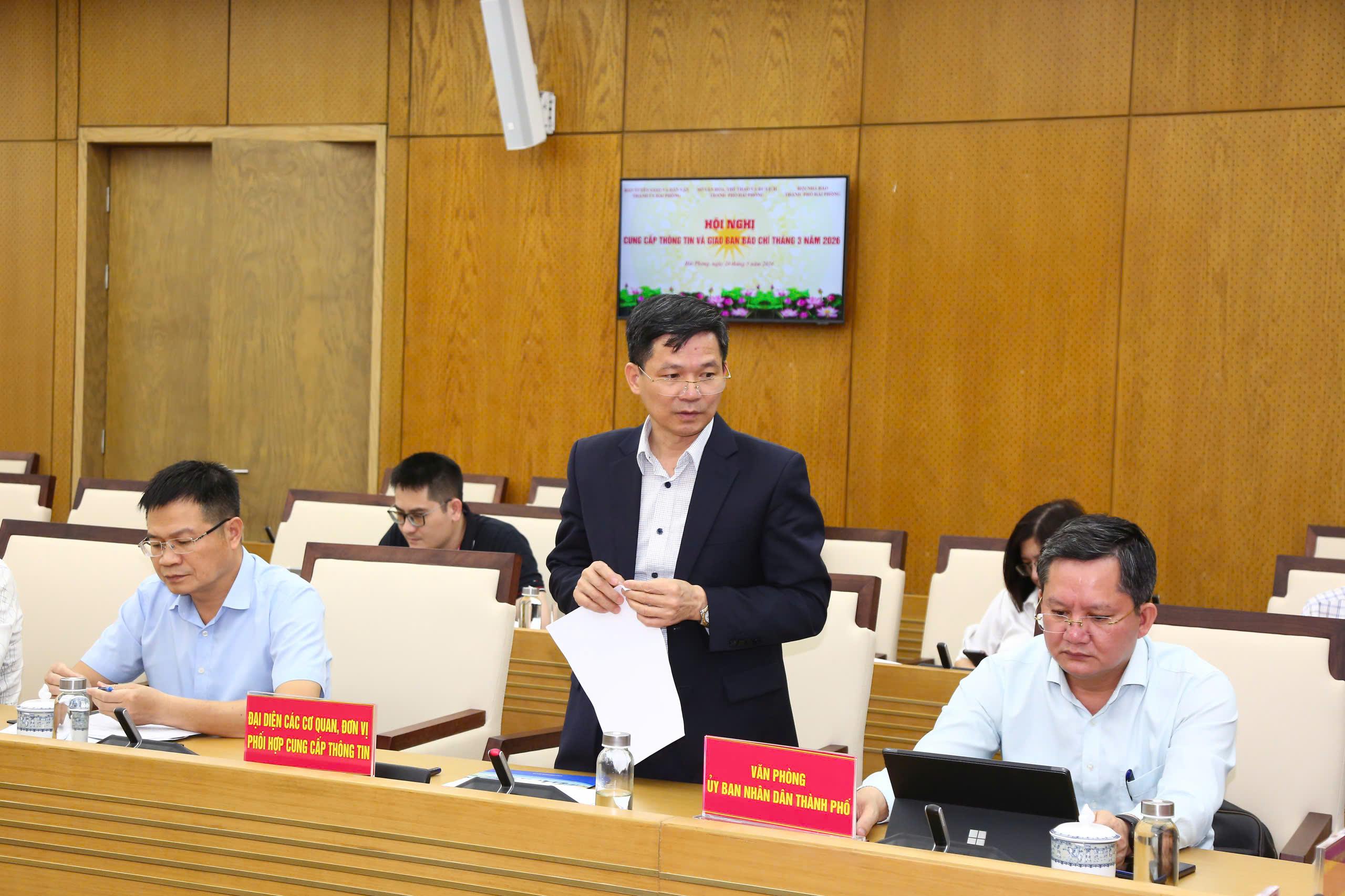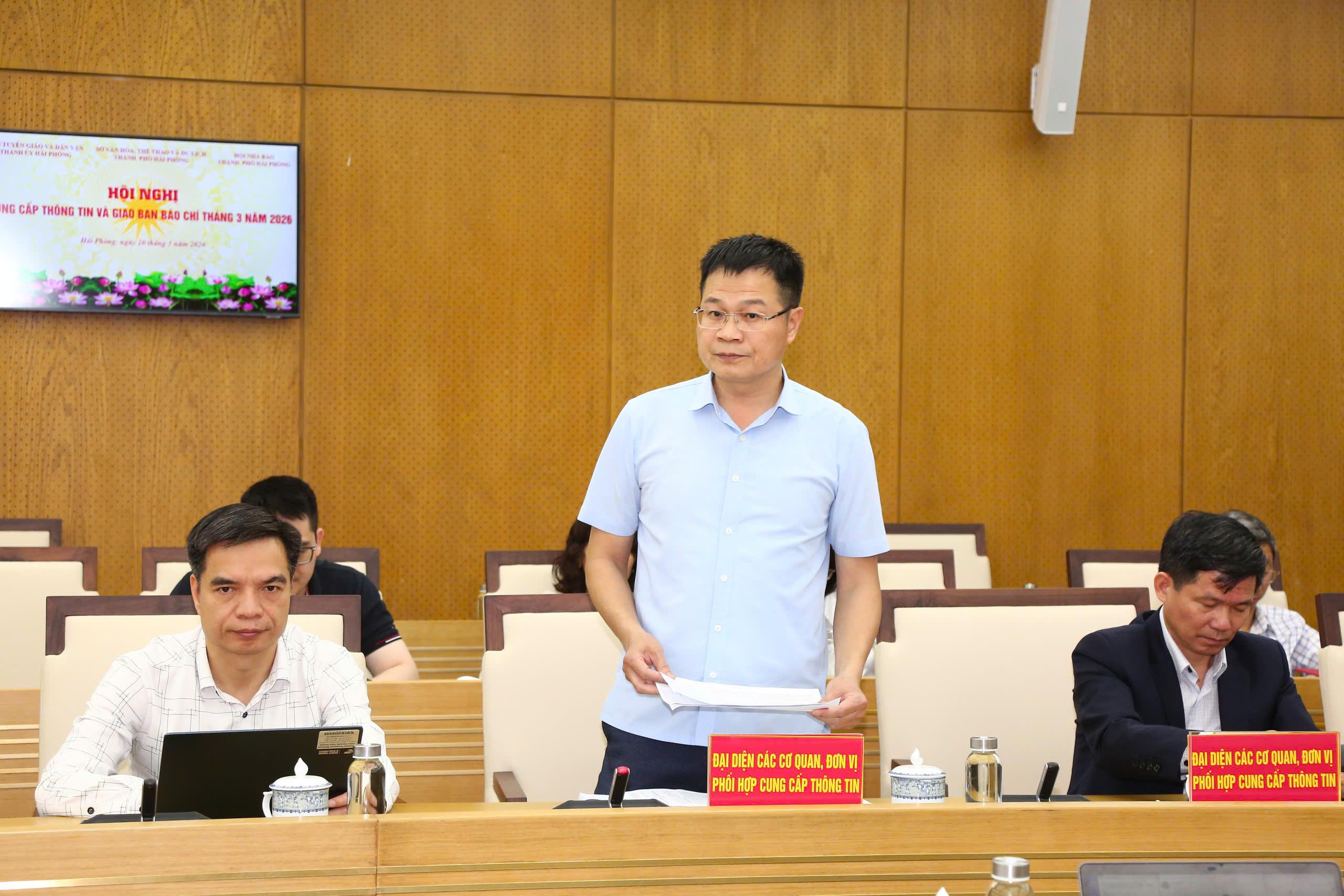 (Haiphong.gov.vn) – Chiều 20/3, Ban Tuyên giáo và Dân vận Thành ủy chủ trì, phối hợp với Sở Văn hóa, Thể thao và Du lịch, Hội Nhà báo thành phố tổ chức Hội nghị cung cấp thông tin và giao ban báo chí định kỳ tháng 3 năm 2026. Hội nghị tập trung vào hai nội dung trọng tâm: Thông tin kết quả bầu cử đại biểu Quốc hội khóa XVI, đại biểu HĐND các cấp nhiệm kỳ 2026 - 2031 và tình hình triển khai các công trình, dự án trọng điểm trên địa bàn thành phố.