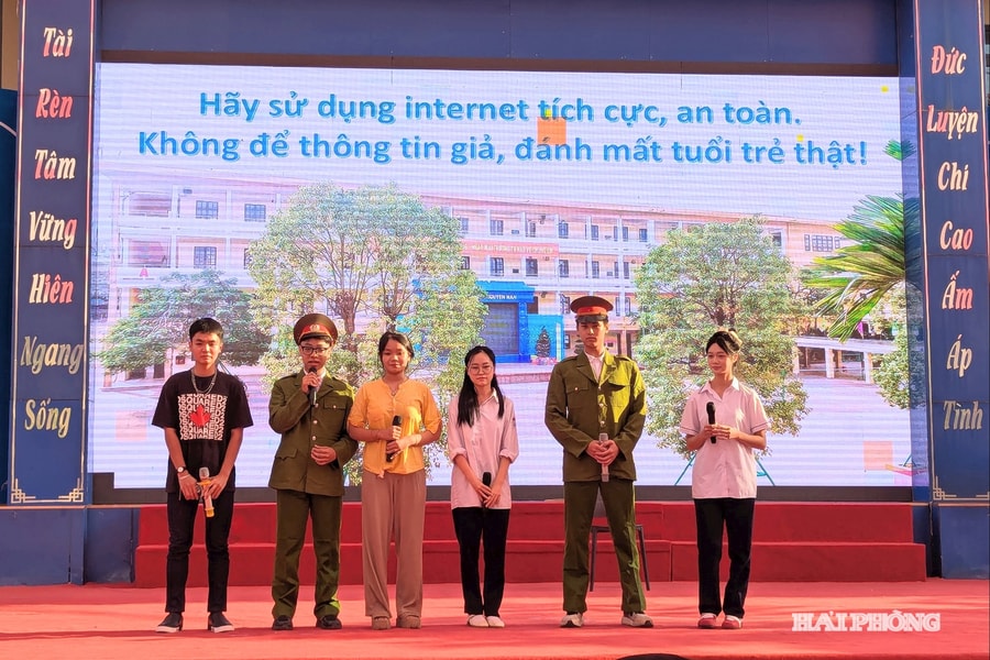 Tại chương trình, các tuyên truyền viên của Công an thành phố truyền đạt 2 chuyên đề: “Nhận diện phương thức, thủ đoạn của tội phạm thao túng, lừa đảo, buôn người qua không gian mạng đối với thanh thiếu niên” và “Nâng cao nhận thức an toàn thông tin trong thời đại số” tới toàn thể hơn 2.000 học sinh của trường.