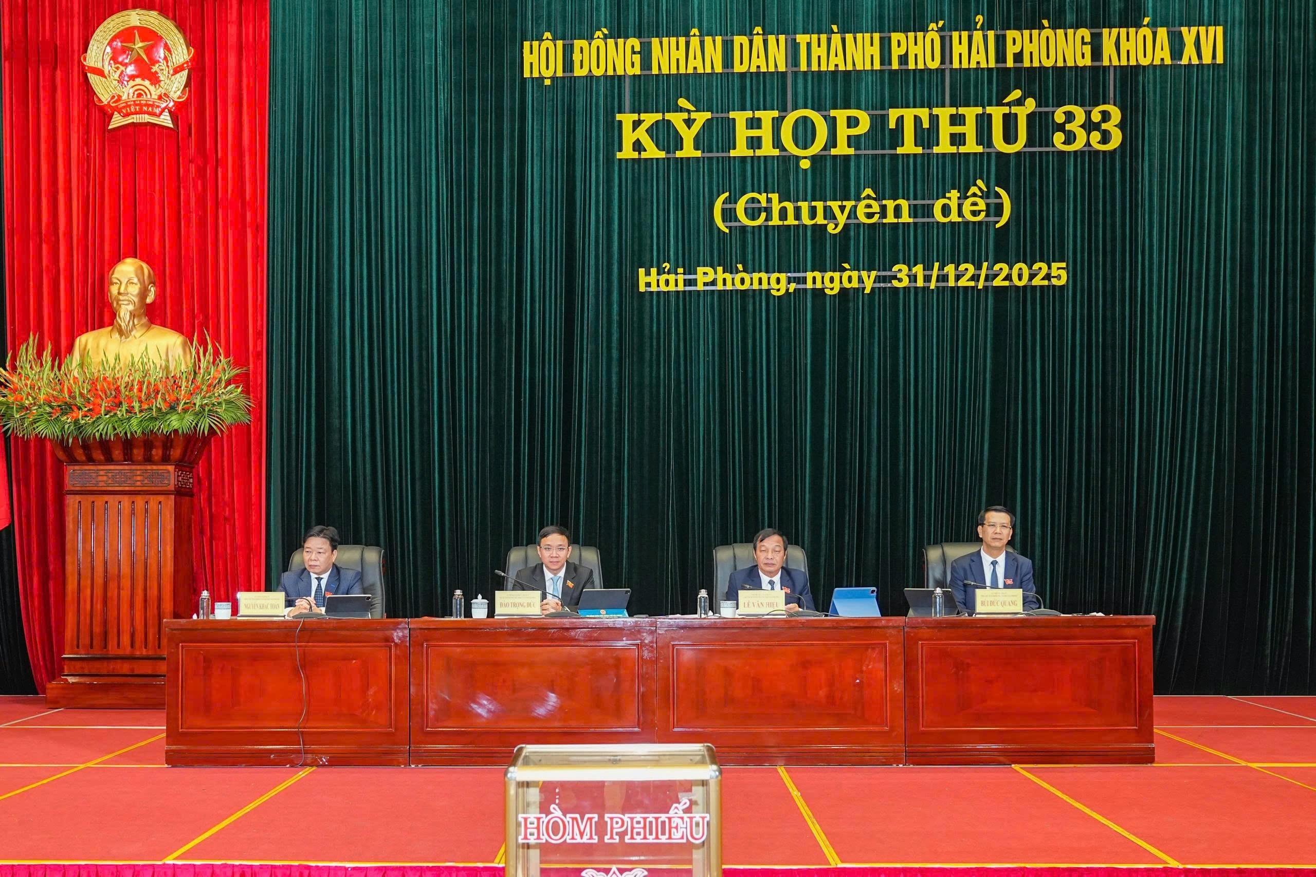 (Haiphong.gov.vn) - Sáng 31/12, HĐND thành phố tổ chức Kỳ họp thứ 33 (kỳ họp chuyên đề) HĐND thành phố khóa XVI, nhiệm kỳ 2021 - 2026 để thực hiện các công việc cấp thiết phát sinh từ thực tiễn trong công tác chỉ đạo, điều hành phát triển kinh tế - xã hội thành phố theo luật định.