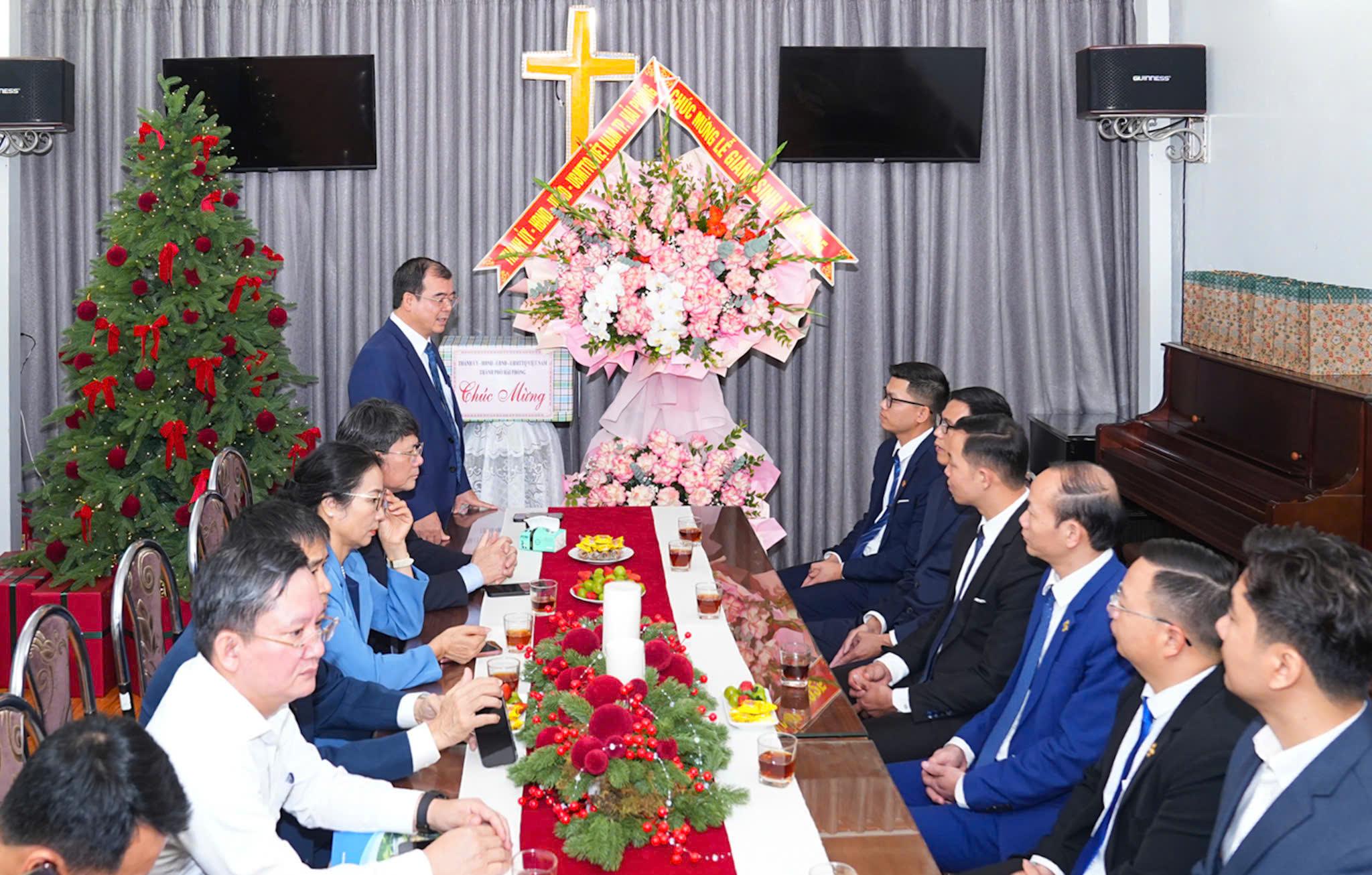 (Haiphong.gov.vn) - Chiều 19/12, đồng chí Phó Chủ tịch UBND thành phố Nguyễn Minh Hùng đến thăm, chúc mừng Hội thánh Tin lành Hải Phòng nhân dịp Lễ Giáng sinh năm 2025. Cùng đi có lãnh đạo Ủy ban MTTQ Việt Nam thành phố, Ban Tuyên giáo và Ban Dân vận Thành ủy, Văn phòng UBND thành phố, Ban Tôn giáo (Sở Nội vụ).