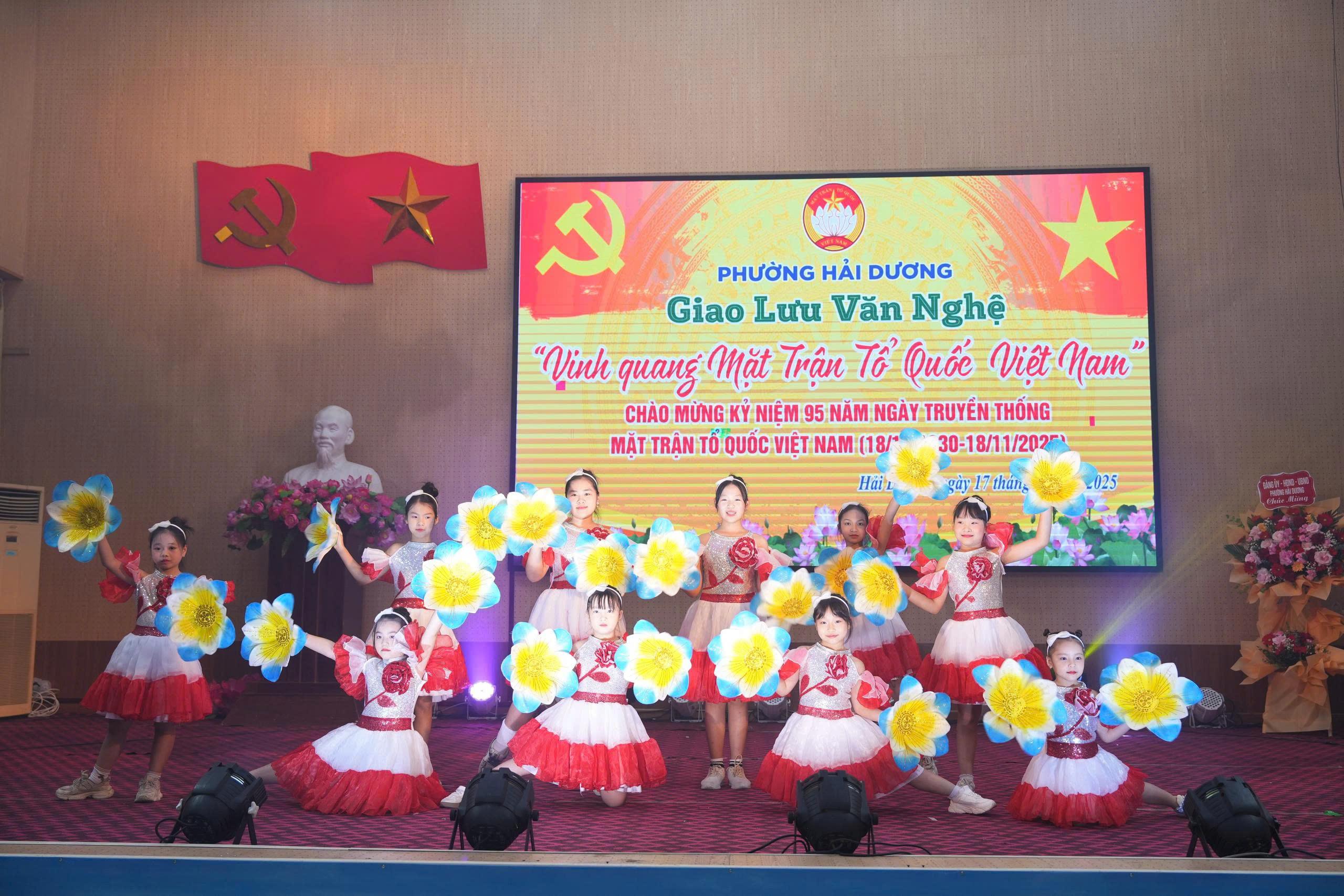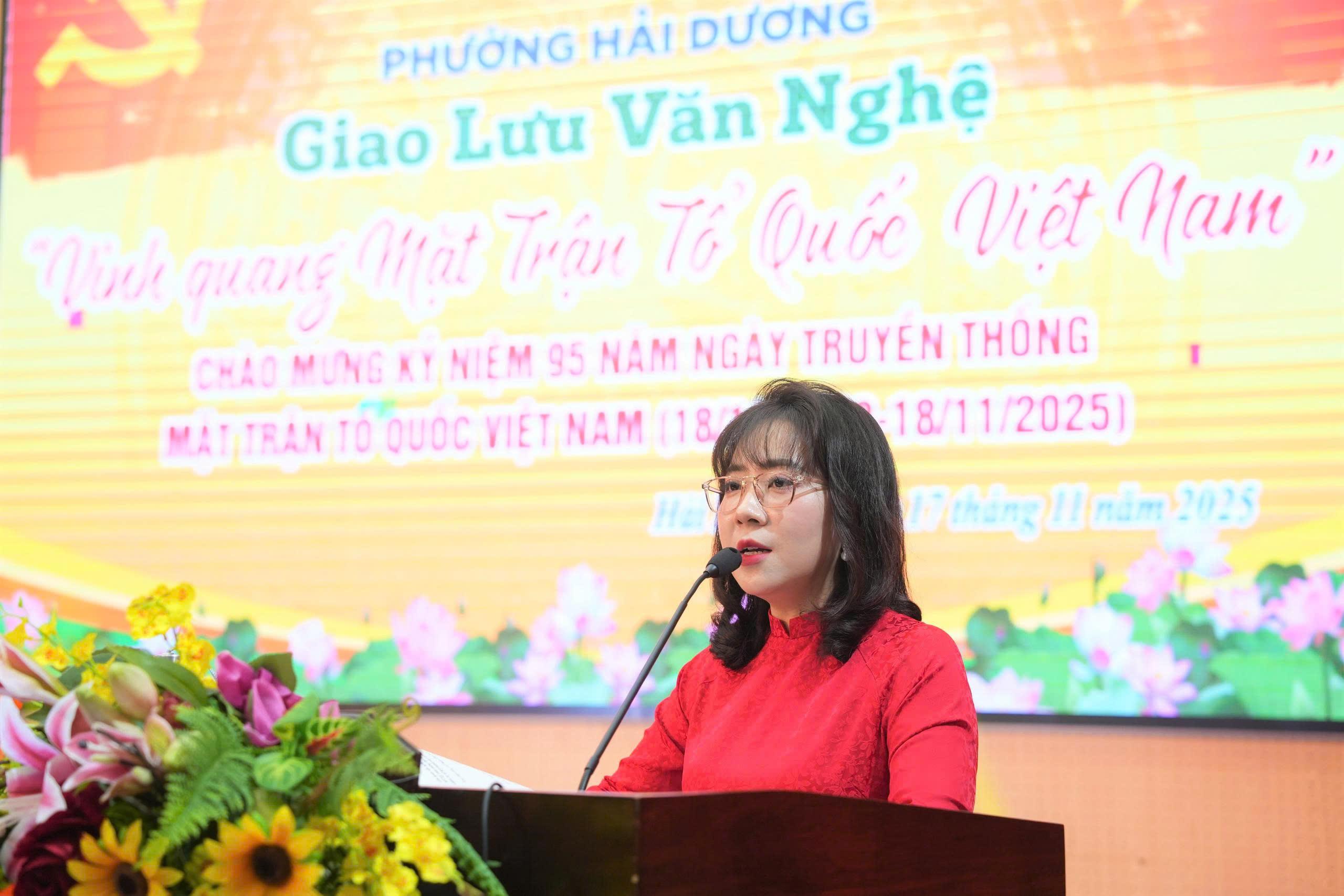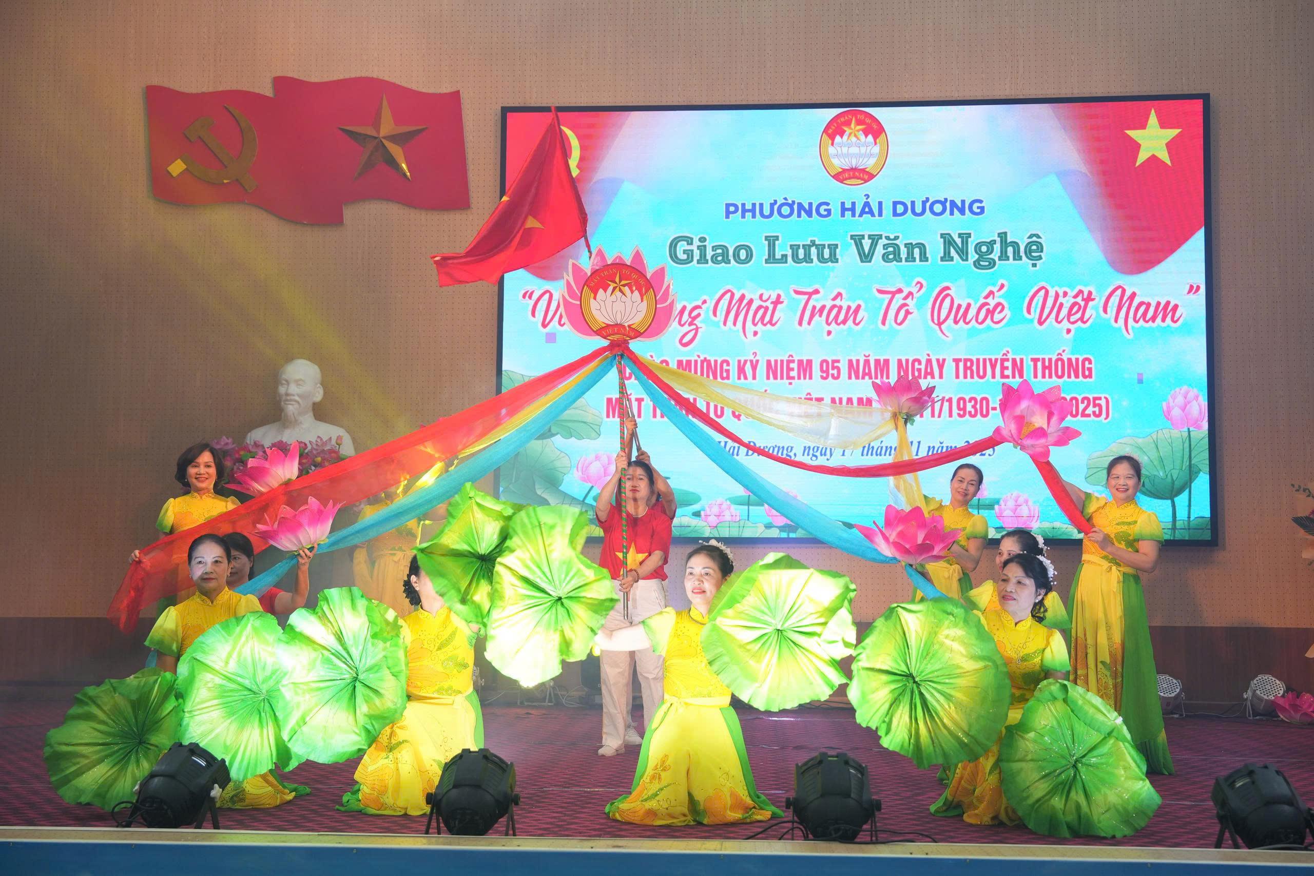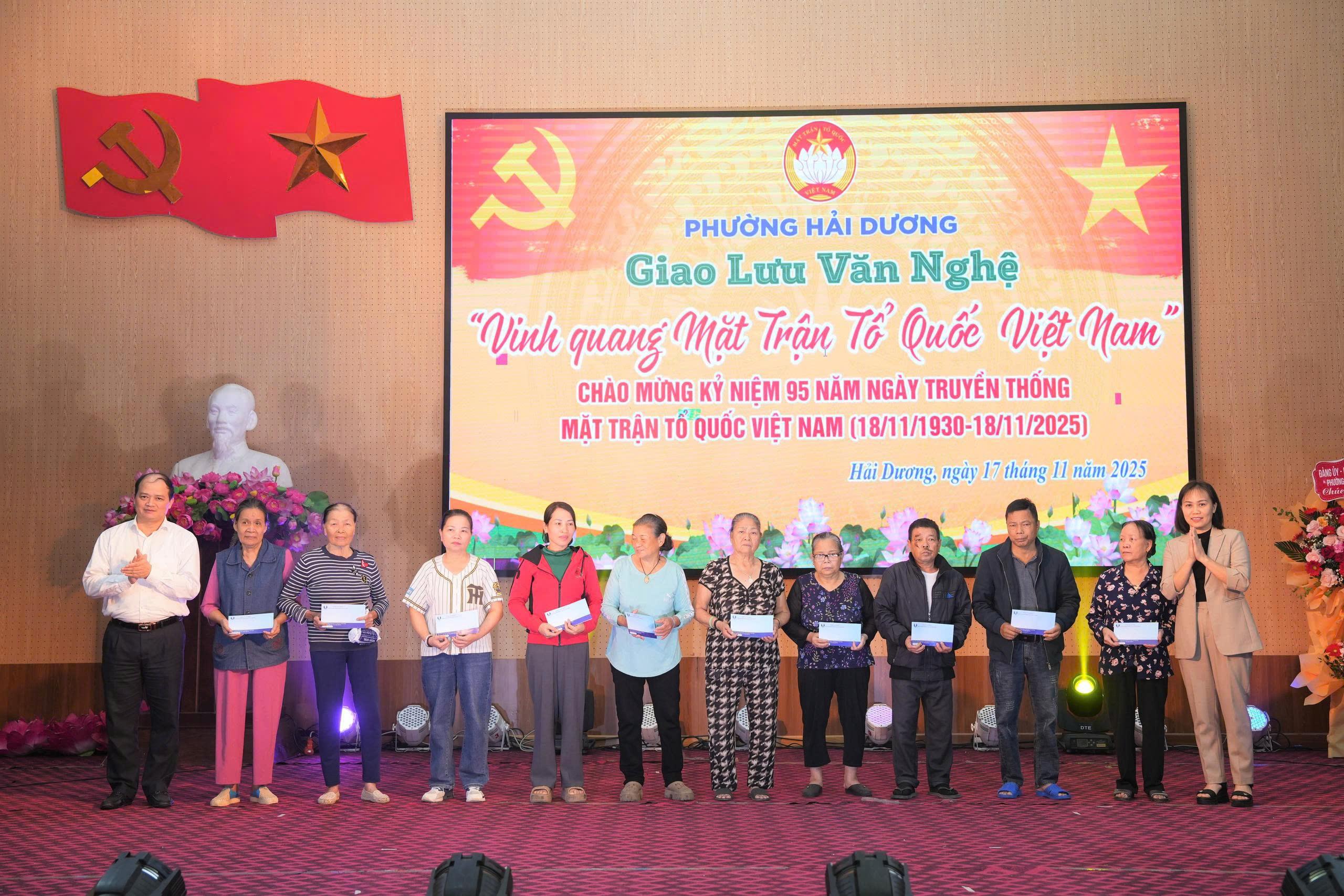 (Haiphong.gov.vn) - Tối 17/11, Ủy ban MTTQ Việt Nam phường Hải Dương tổ chức chương trình giao lưu văn nghệ với chủ đề “Vinh quang Mặt trận Tổ quốc Việt Nam”, thiết thực chào mừng kỷ niệm 95 năm Ngày truyền thống MTTQ Việt Nam (18/11/1930 – 18/11/2025); chào mừng Đại hội đại biểu MTTQ Việt Nam và các tổ chức chính trị – xã hội thành phố Hải Phòng lần thứ I, nhiệm kỳ 2025–2030; đồng thời hưởng ứng Tháng “Vì người nghèo” năm 2025.