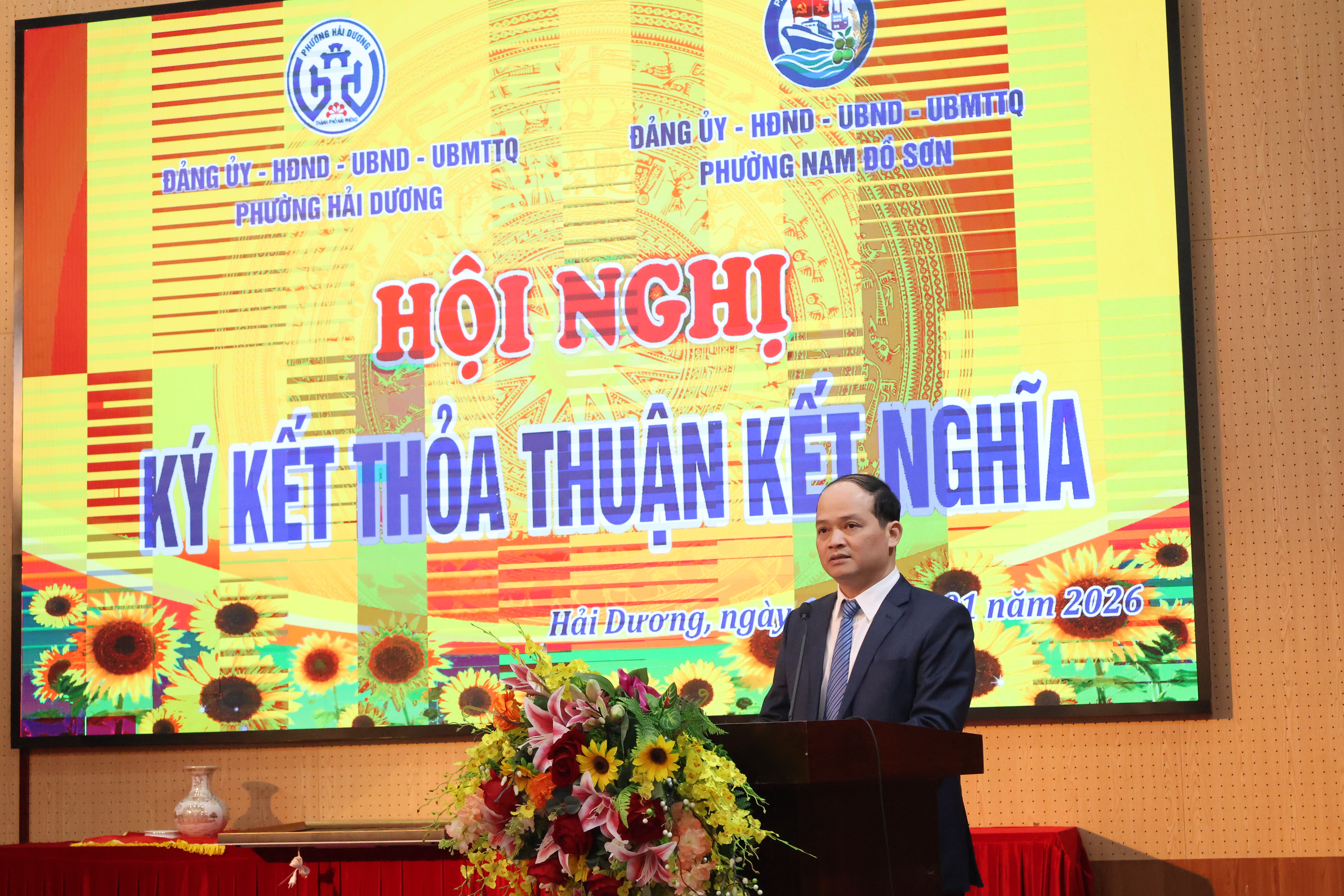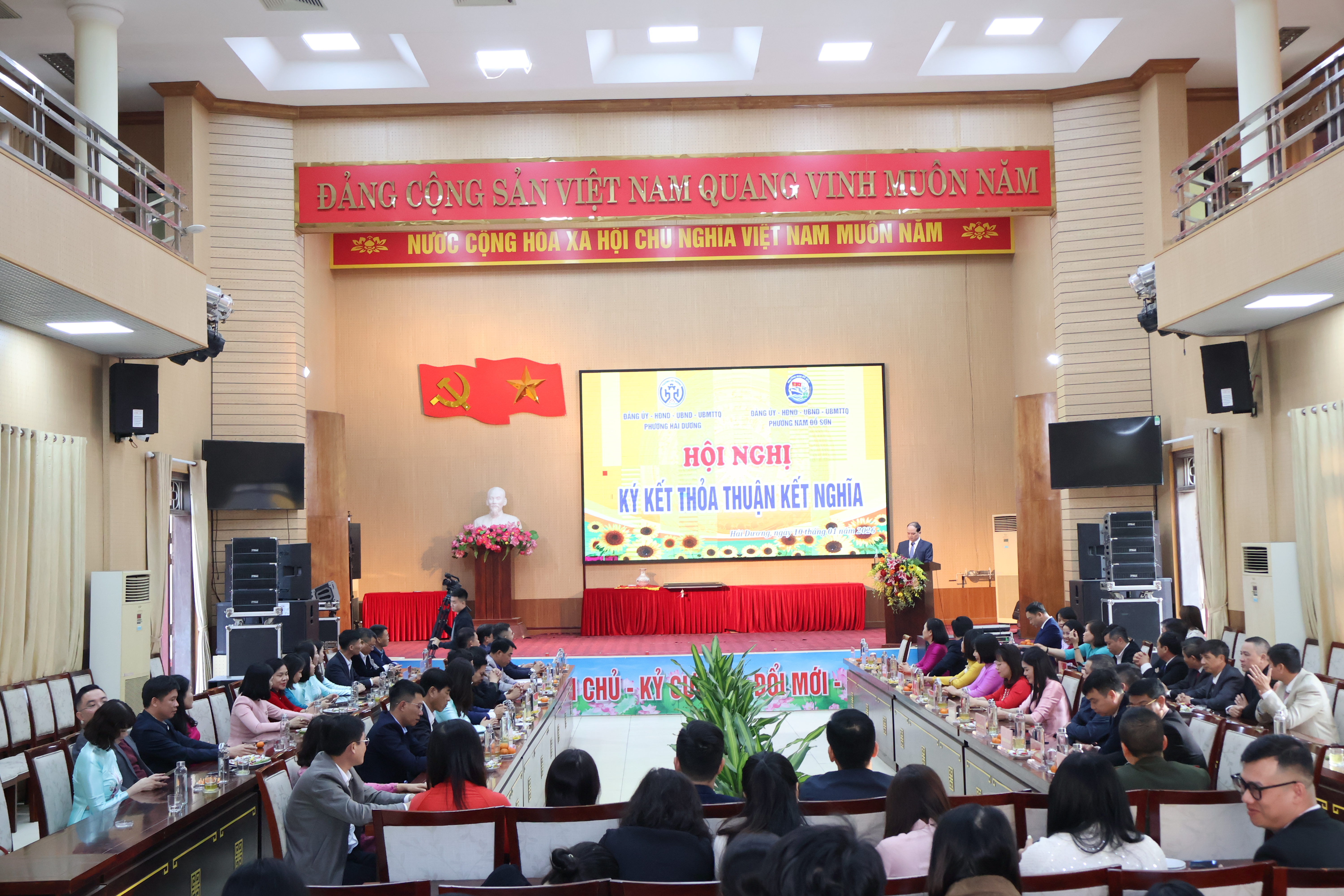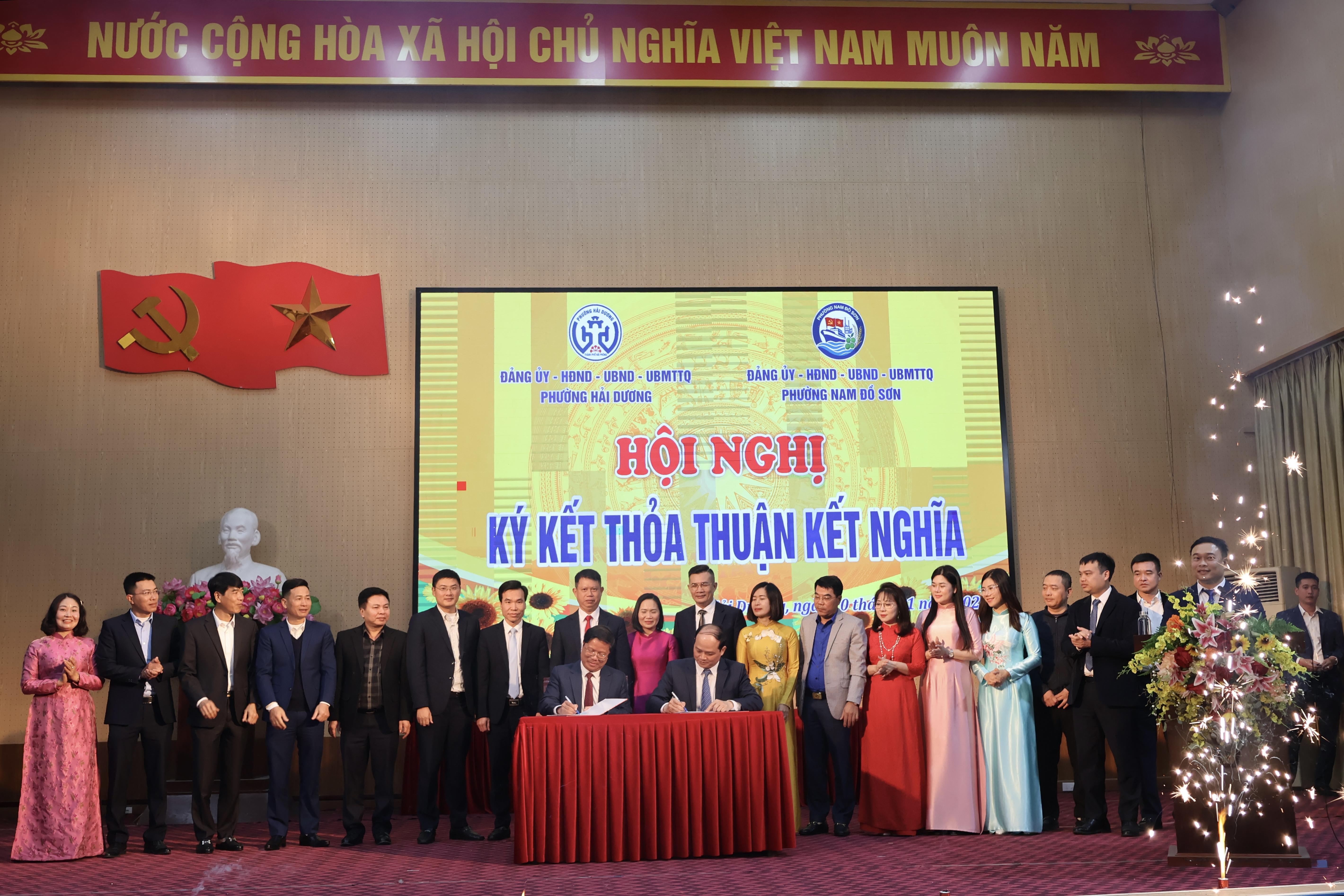 (Haiphong.gov.vn) - Chiều 10/01, Đảng ủy, HĐND, UBND, Ủy ban MTTQ Việt Nam phường Hải Dương và phường Nam Đồ Sơn long trọng tổ chức hội nghị ký kết chương trình kết nghĩa, hợp tác nhằm phát huy truyền thống đoàn kết, tinh thần tương trợ, đồng hành cùng nhau trên con đường phát triển bền vững.