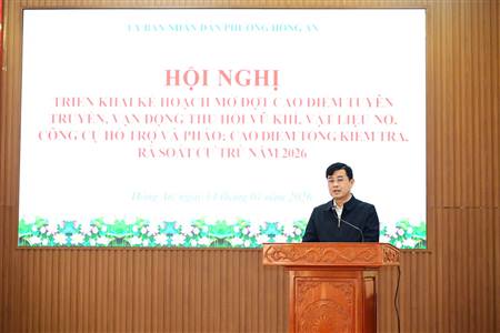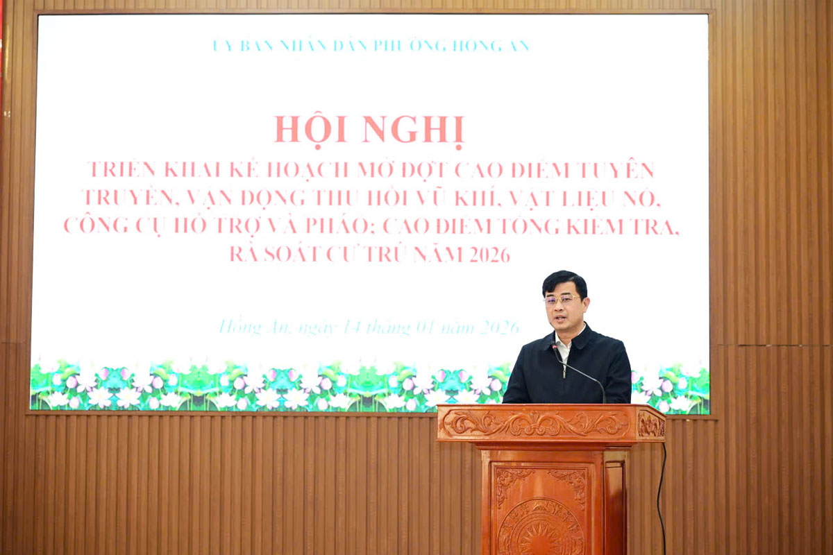 (Haiphong.gov.vn) - Sáng 14/01, UBND phường Hồng An tổ chức Hội nghị triển khai đợt cao điểm tuyên truyền, vận động thu hồi vũ khí, vật liệu nổ, công cụ hỗ trợ và pháo; cao điểm tổng kiểm tra, rà soát cư trú trên địa bàn, góp phần bảo đảm an ninh trật tự Đại hội đại biểu toàn quốc lần thứ XIV, bầu cử đại biểu Quốc hội và HĐND các cấp, nhiệm kỳ 2026 - 2031 và Tết Nguyên đán Bính Ngọ năm 2026. Đồng chí Nguyễn Hữu Thanh, Phó Bí thư Đảng ủy, Chủ tịch UBND phường dự, chỉ đạo Hội nghị.