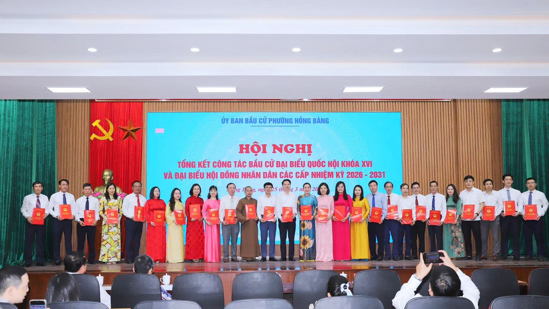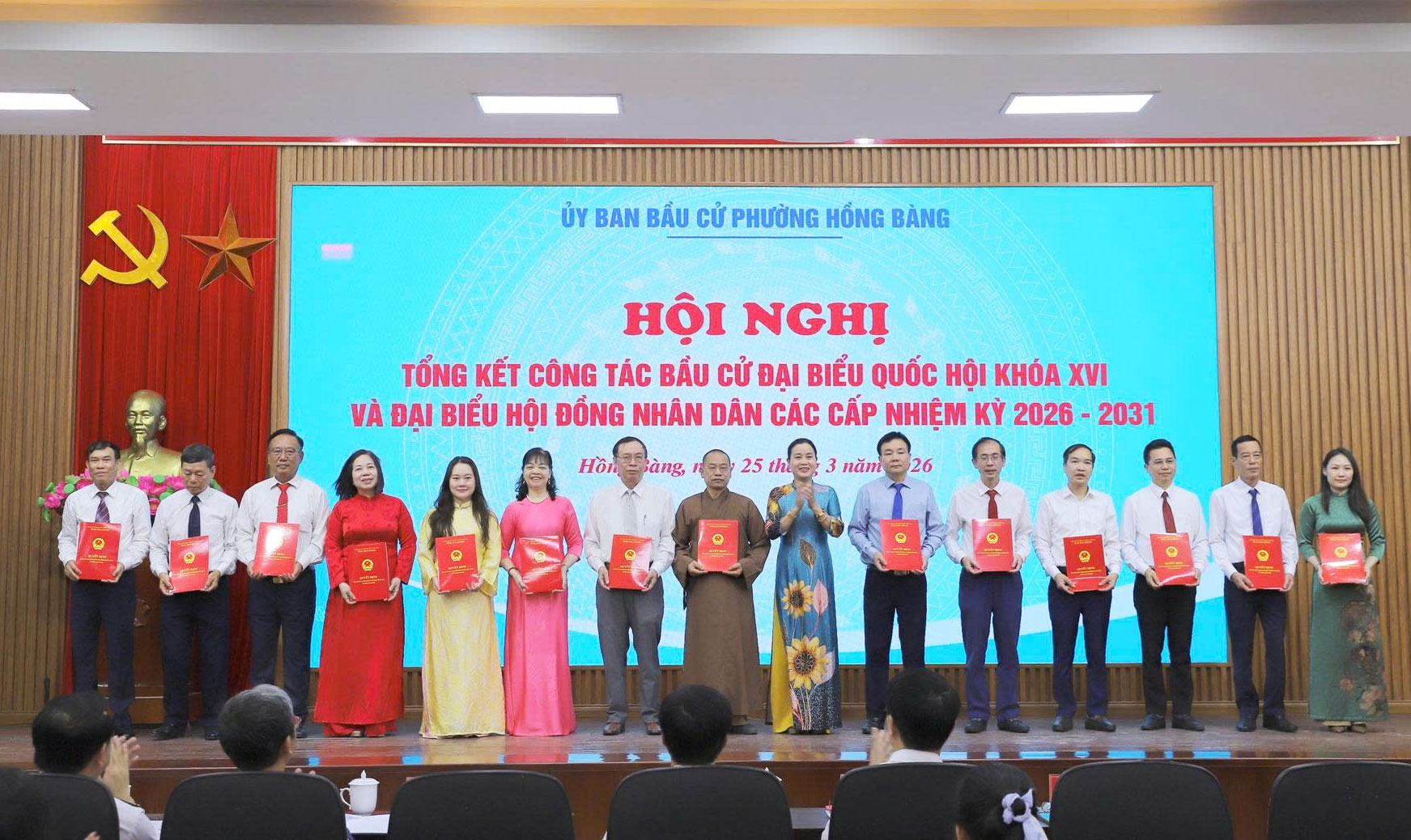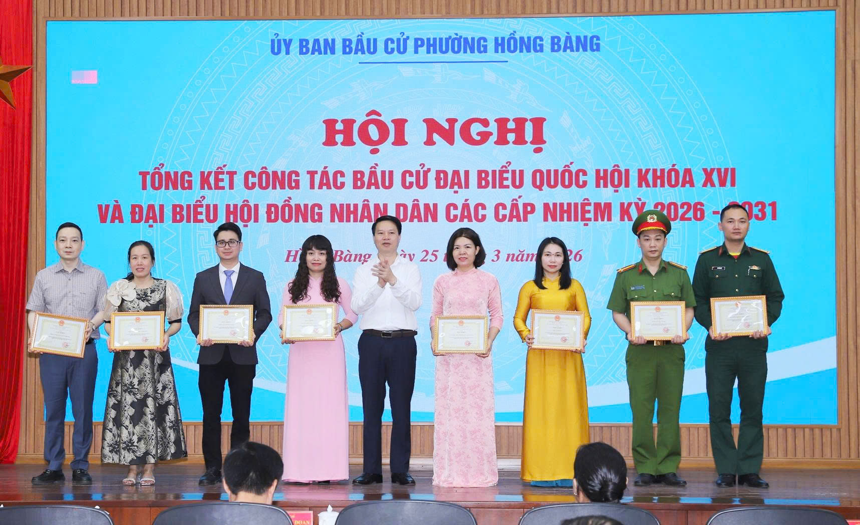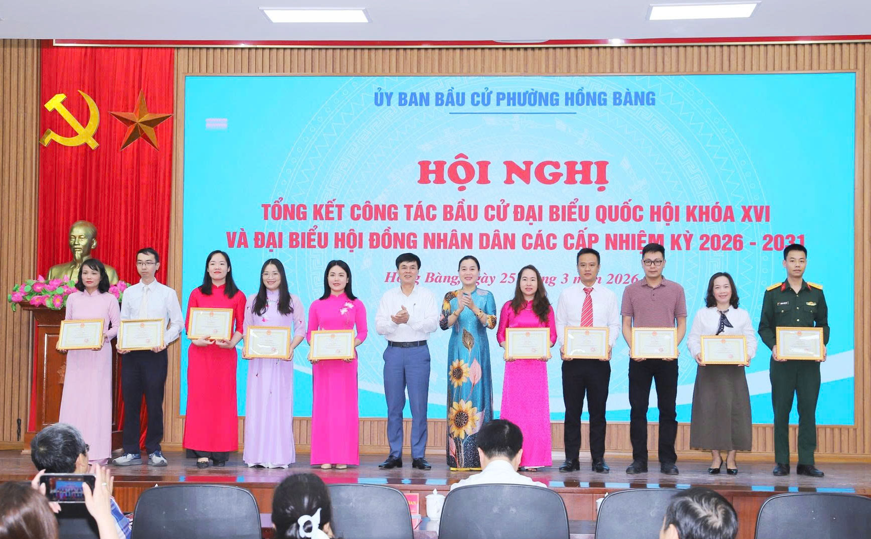 Tại Hội nghị, Chủ tịch UBND phường Hồng Bàng đã Quyết định khen thưởng 37 tập thể, 29 cá nhân có thành tích xuất sắc trong công tác bầu cử đại biểu Quốc hội khóa XVI và đại biểu HĐND các cấp, nhiệm kỳ 2026 - 2031. Đồng thời công bố Nghị quyết xác nhận tư cách đại biểu HĐND phường, nhiệm kỳ 2026 - 2031; trao Giấy chứng nhận đại biểu HĐND phường khóa II, nhiệm kỳ 2026 - 2031./.