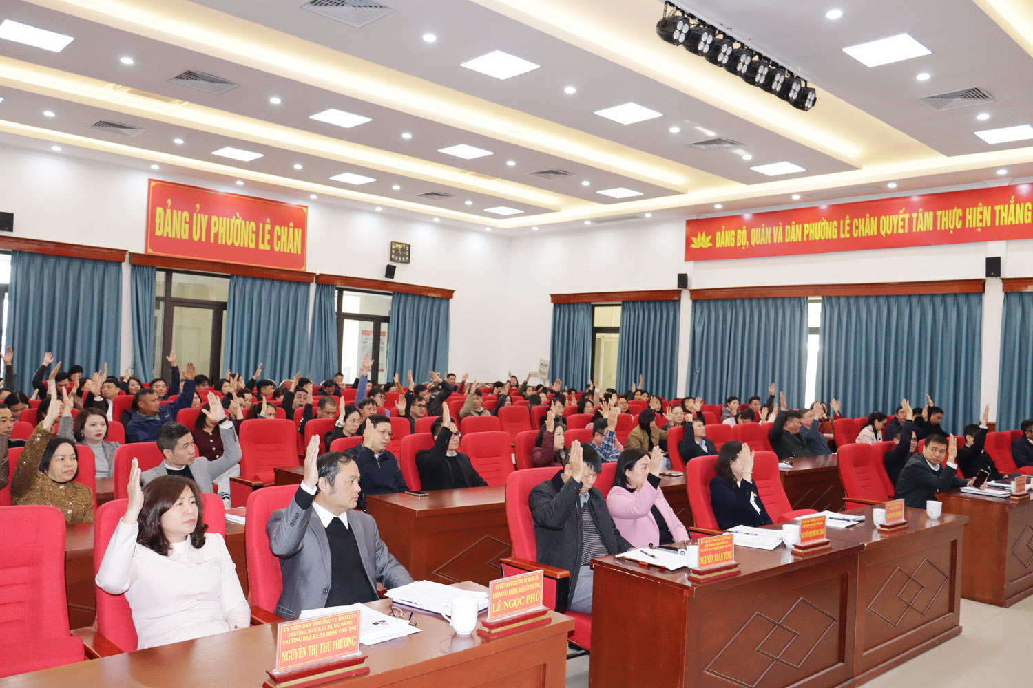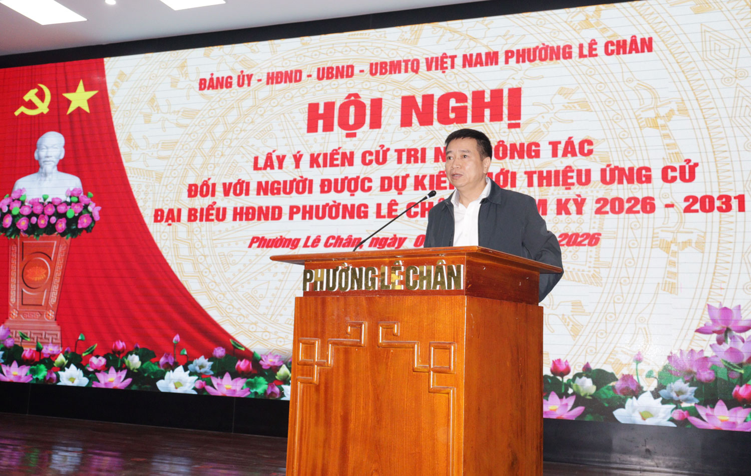 (Haiphong.gov.vn) - Sáng 9/01, Đảng ủy - HĐND - UBND - Ủy ban MTTQ Việt Nam phường Lê Chân tổ chức Hội nghị lấy ý kiến cử tri nơi công tác đối với người được dự kiến giới thiệu ứng cử đại biểu HĐND phường, nhiệm kỳ 2026 - 2031. Đồng chí Đặng Đông Anh, Ủy viên Thành ủy, Bí thư Đảng ủy, Chủ tịch HĐND phường chủ trì Hội nghị.