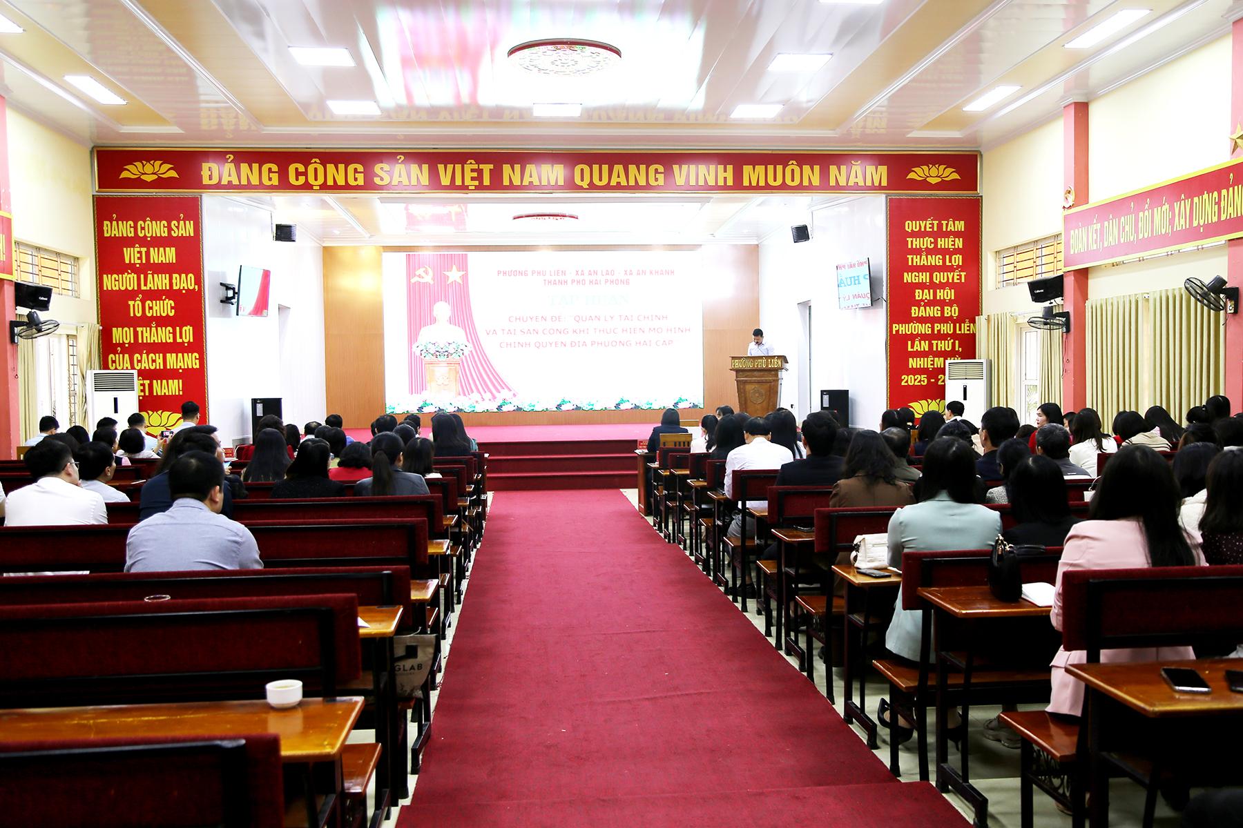(Haiphong.gov.vn) – Sáng 2/11, tại Hội trường Đảng ủy phường Phù Liễn; phường Phù Liễn – xã An Lão – xã An Khánh tổ chức tập huấn chuyên đề “Quản lý tài chính và tài sản công khi thực hiện mô hình chính quyền địa phương hai cấp”. Dự Hội nghị có các đồng chí: Bùi Thị Tuyết Mai - Bí thư Đảng ủy, Chủ tịch HĐND phường Phù Liễn; Phạm Văn Diện - Phó Bí thư Đảng ủy, Chủ tịch UBND phường Phù Liễn; Ngô Thị Thanh Thủy - Bí thư Đảng ủy, Chủ tịch HĐND xã An Lão; Đinh Thành Đồng – Phó Bí thư Đảng ủy, Chủ tịch UBND xã An Lão; Phạm Thị Hoa - Phó Bí thư Đảng ủy, Chủ tịch UBND xã An Khánh. Tham dự tập huấn có gần 200 cán bộ, công chức, viên chức, kế toán các cơ quan, đơn vị, trường học 3 địa phương: xã An Lão, xã An Khánh, phường Phù Liễn.