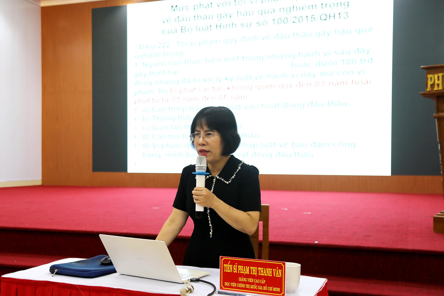 Tiến sĩ Phạm Thị Thanh Vân – giảng viên cao cấp Viện Kinh tế - Xã hội và môi trường, Học viện Chính trị Quốc gia Hồ Chí Minh truyền đạt nội dung tập huấn tại Hội nghị