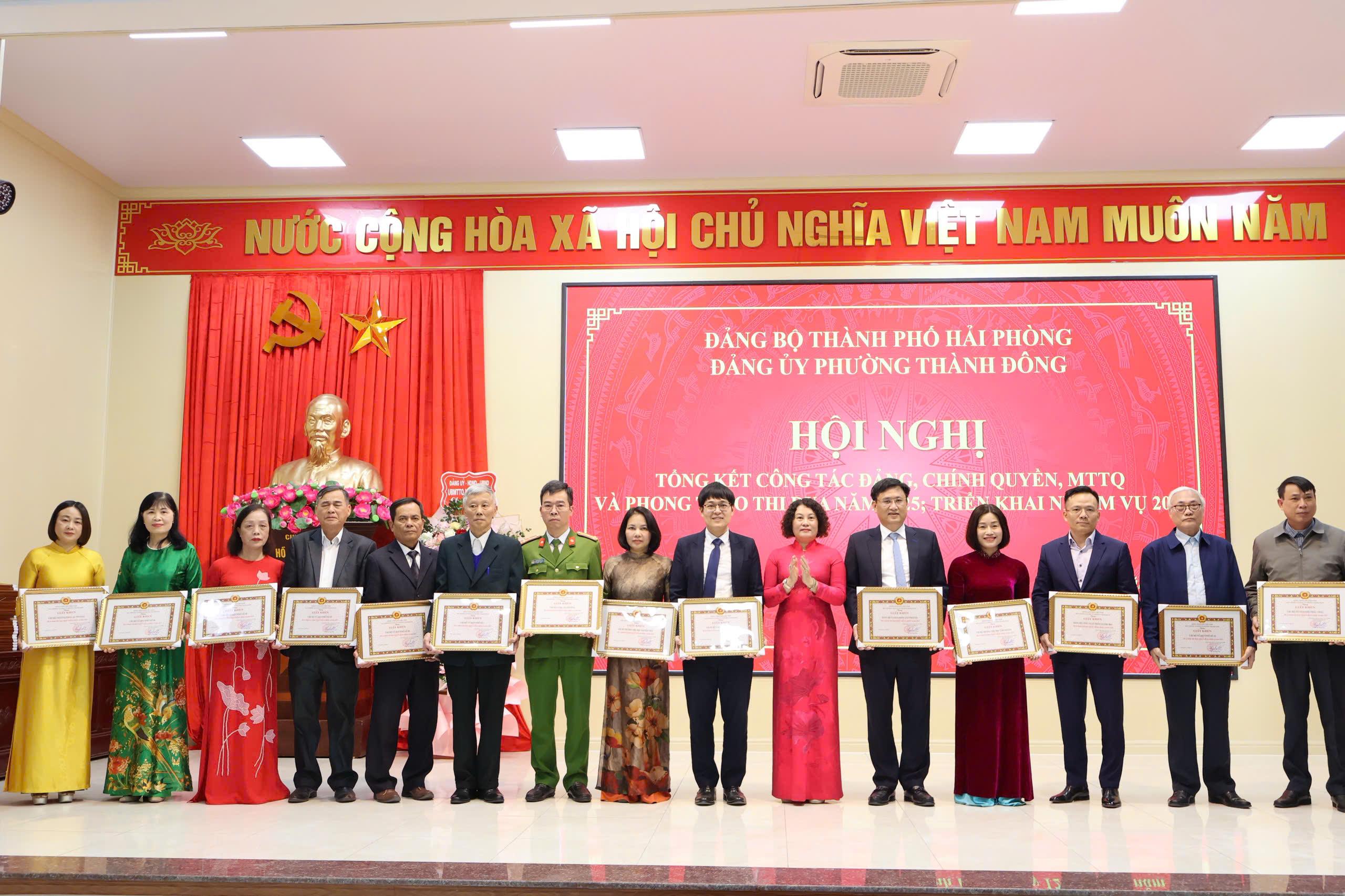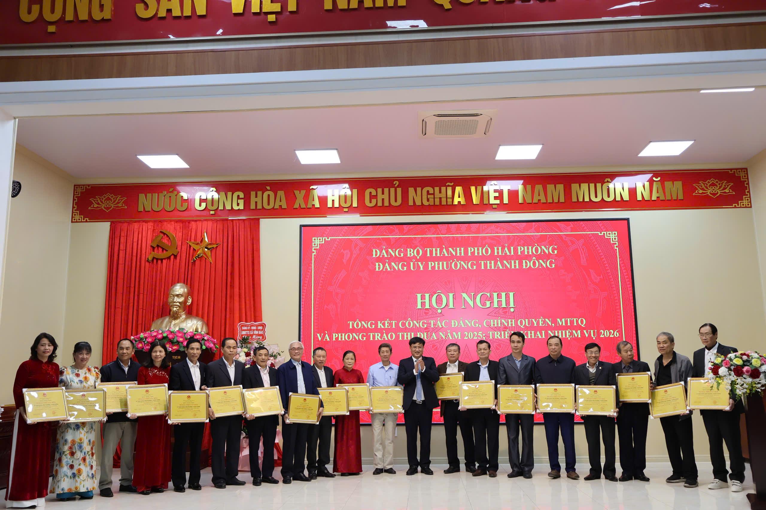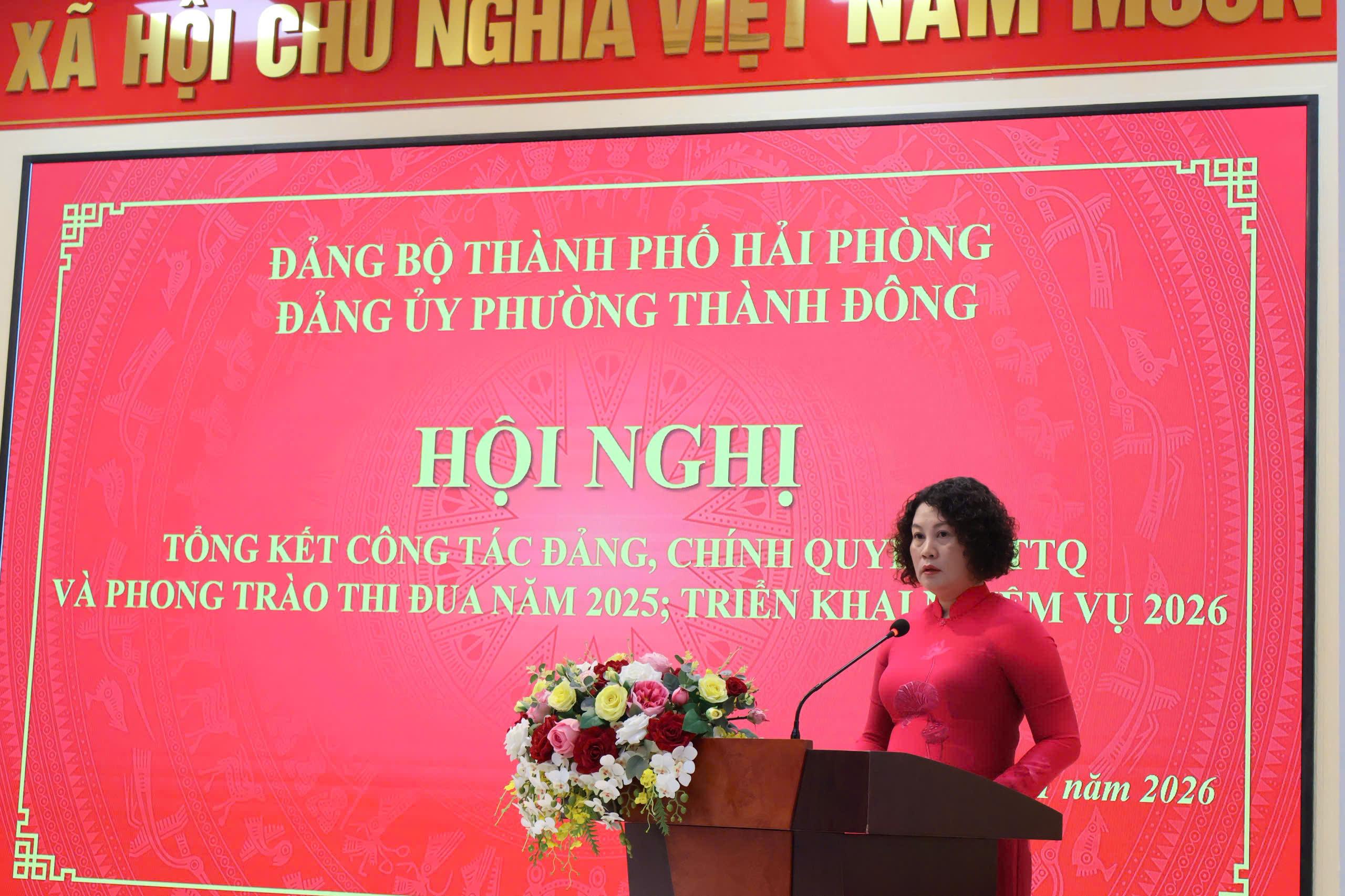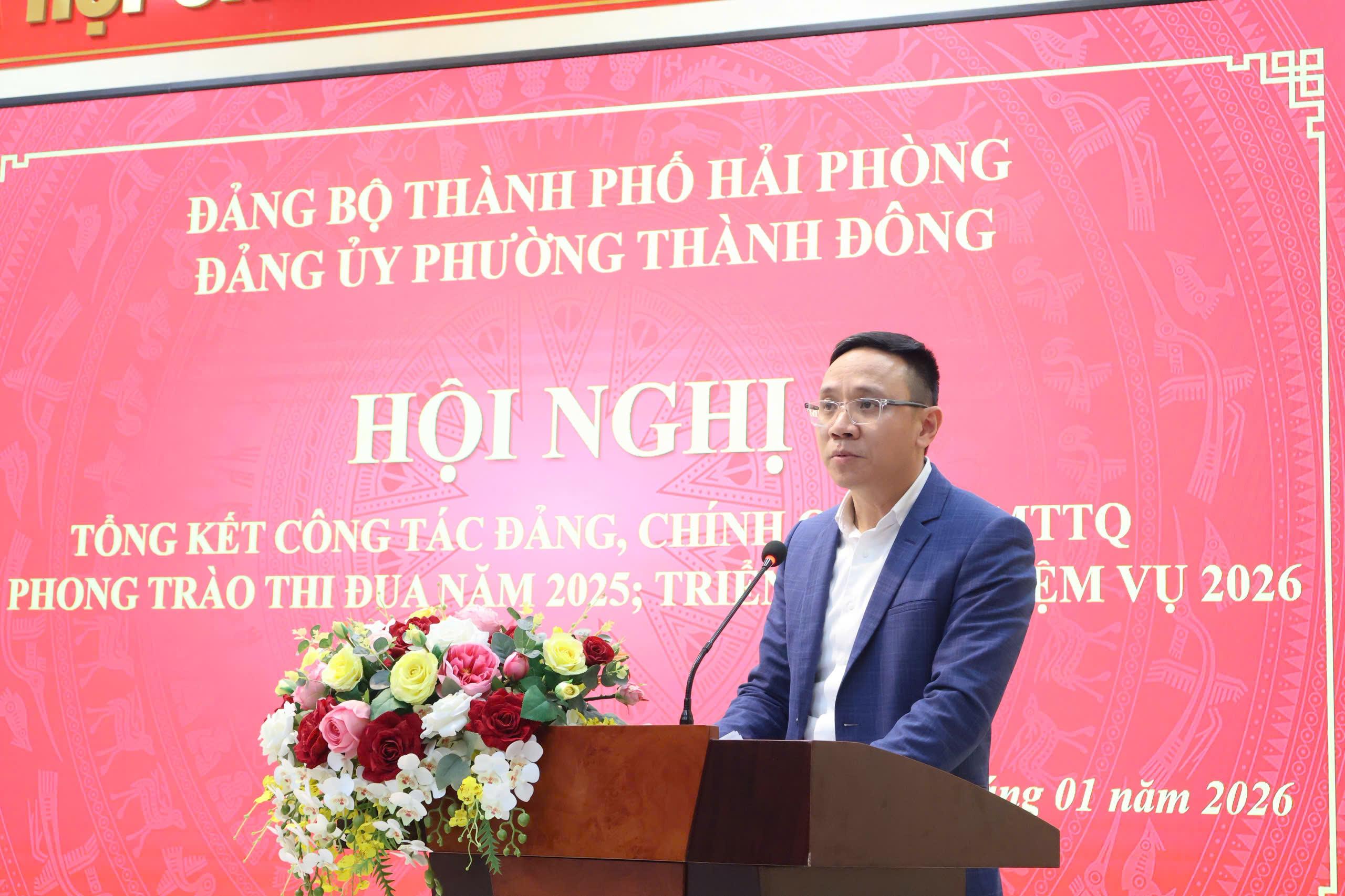 (Haiphong.gov.vn) - Chiều 12/01, Đảng ủy phường Thành Đông tổ chức hội nghị tổng kết công tác Đảng, chính quyền, Mặt trận Tổ quốc và phong trào thi đua năm 2025, triển khai nhiệm vụ năm 2026. Đồng chí Đào Trọng Đức, Ủy viên Ban thường vụ Thành ủy, Phó Chủ tịch thường trực HĐND thành phố dự hội nghị.