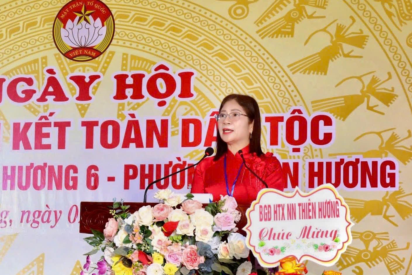 Phát biểu tại Ngày hội, đồng chí Vương Toàn Thu Thủy, Bí thư Đảng ủy, Chủ tịch HĐND phường biểu dương những kết quả mà Chi bộ, Ban công tác Mặt trận, các đoàn thể và nhân dân Tổ dân phố Thiên Hương 6 đạt được trong năm qua. Đồng chí nhấn mạnh: trong bối cảnh thành phố Hải Phòng triển khai mô hình chính quyền địa phương hai cấp, mỗi khu dân cư chính là nền tảng vững chắc của khối đại đoàn kết toàn dân tộc. Các phong trào thi đua, các cuộc vận động nếu được thực hiện hiệu quả ngay từ cơ sở sẽ góp phần thực hiện thắng lợi mục tiêu xây dựng “Thành phố văn minh – xã phường hạnh phúc”.