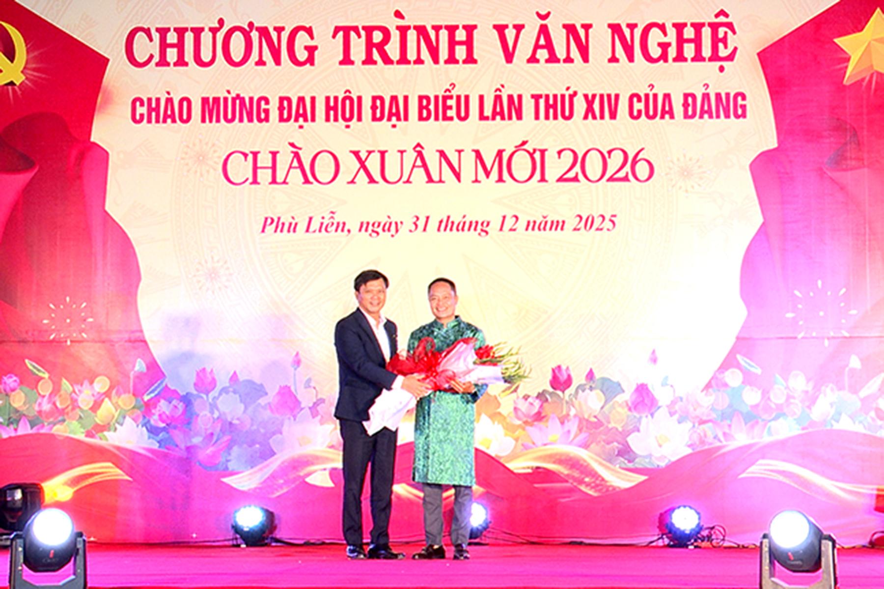 (Haiphong.gov.vn) - Tối 31/12, tại Sân khấu ngoài trời Nhà thi đấu đa năng phường Phù Liễn, Đảng ủy – HĐND – UBND – Ủy ban MTTQ Việt Nam phường tổ chức chương trình văn nghệ chào mừng Đại hội đại biểu lần thứ XIV của Đảng, chào Xuân mới 2026. Tới dự có các đồng chí: Phạm Văn Diện – Chủ tịch UBND phường; Phạm Tiến Thắng - Phó Bí thư Thường trực Đảng ủy phường; Hoàng Thị Minh Thúy - Chủ tịch Ủy ban MTTQ Việt Nam phường.