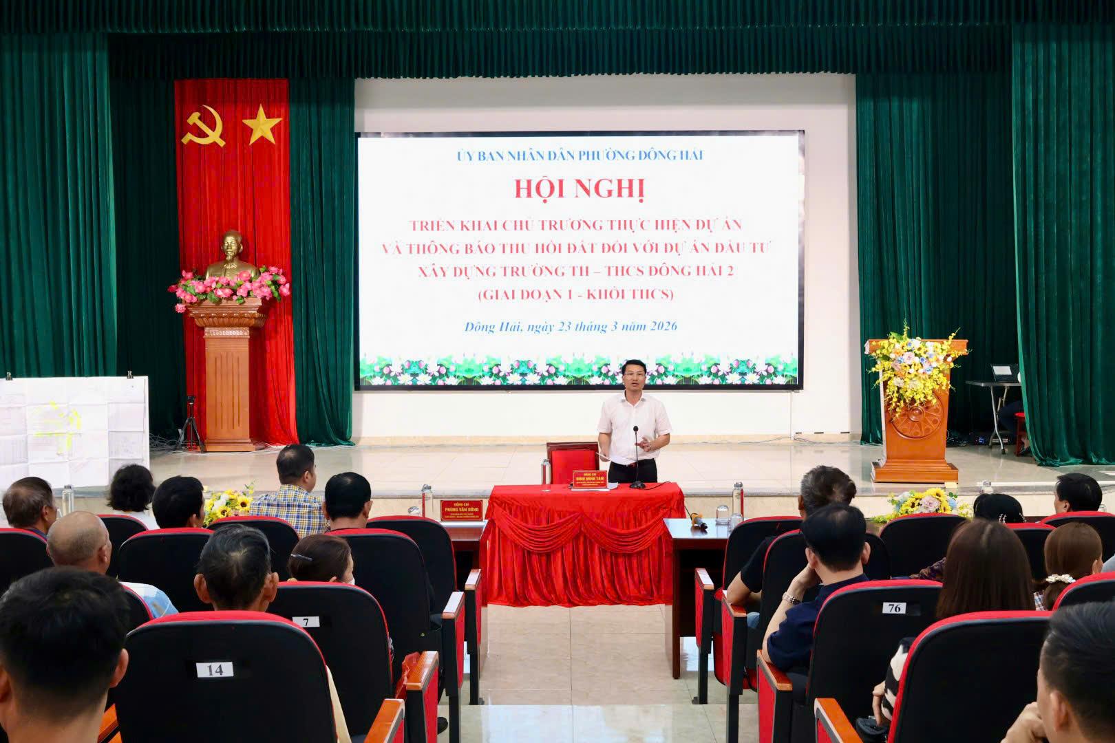 Kết luận Hội nghị, Phó Chủ tịch Thường trực UBND phường Đông Hải Đinh Minh Tâm nhấn mạnh, đây là Dự án trọng điểm, có ý nghĩa quan trọng đối với phát triển kinh tế - xã hội của địa phương, đặc biệt trong việc đáp ứng nhu cầu dạy và học trên địa bàn. Phó Chủ tịch phường đề nghị các hộ gia đình, cá nhân có đất bị thu hồi đồng thuận, ủng hộ chủ trương của Nhà nước; chủ động cung cấp đầy đủ hồ sơ, tài liệu liên quan đến nguồn gốc, quá trình sử dụng đất và tài sản gắn liền với đất; phối hợp chặt chẽ với Hội đồng bồi thường trong công tác kiểm đếm ngoài thực địa. Đồng thời, giao Phòng Kinh tế, Hạ tầng và Đô thị chủ trì, phối hợp với Ban Quản lý dự án và các đơn vị liên quan rà soát hồ sơ, xác minh nguồn gốc sử dụng đất; tham mưu UBND phường hoàn thiện phương án thu hồi đất, bồi thường, hỗ trợ và tái định cư theo đúng quy định; quản lý chặt chẽ khu đất sau thu hồi, không để phát sinh vi phạm. Giao Công an phường bảo đảm an ninh trật tự trong quá trình triển khai; các tổ chức chính trị - xã hội tăng cường tuyên truyền, vận động, tạo sự đồng thuận trong Nhân dân.