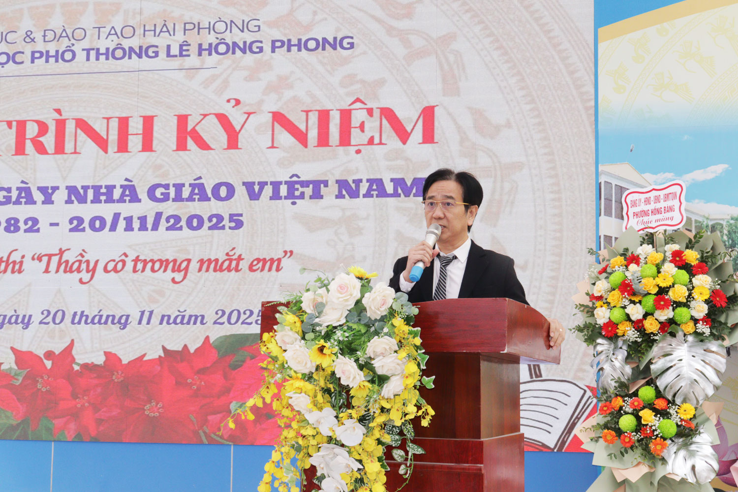 Tại chương trình, nhà giáo Đinh Hồng Tiệp, Hiệu trưởng Trường THPT Lê Hồng Phong đã đọc diễn văn ôn lại kỷ niệm 43 năm Ngày Nhà giáo Việt Nam, trong đó nhấn mạnh, ngày 20/11 là dịp để thể hiện tình cảm tốt đẹp đối với những người làm công tác giáo dục, khẳng định những cống hiến, đóng góp của những nhà giáo, thể hiện truyền thống tốt đẹp “Tôn sư trọng đạo”; đồng thời biểu thị niềm tin, lòng mong mỏi của toàn xã hội đối với các thầy cô, đòi hỏi mỗi nhà giáo phải không ngừng phấn đấu rèn luyện, trau dồi đạo đức, tình yêu nghề nghiệp, nâng cao trình độ chuyên môn nghiệp vụ, hoàn thành tốt nhiệm vụ, xứng đáng với sứ mệnh cao cả của nghề dạy học, “nghề cao quý nhất trong những nghề cao quý”.