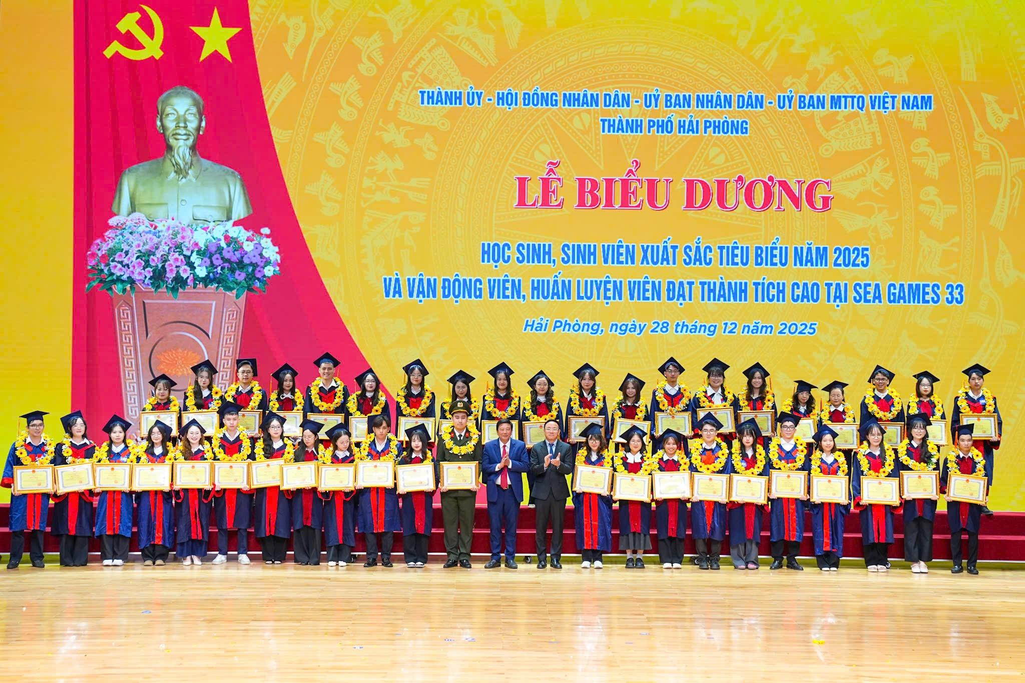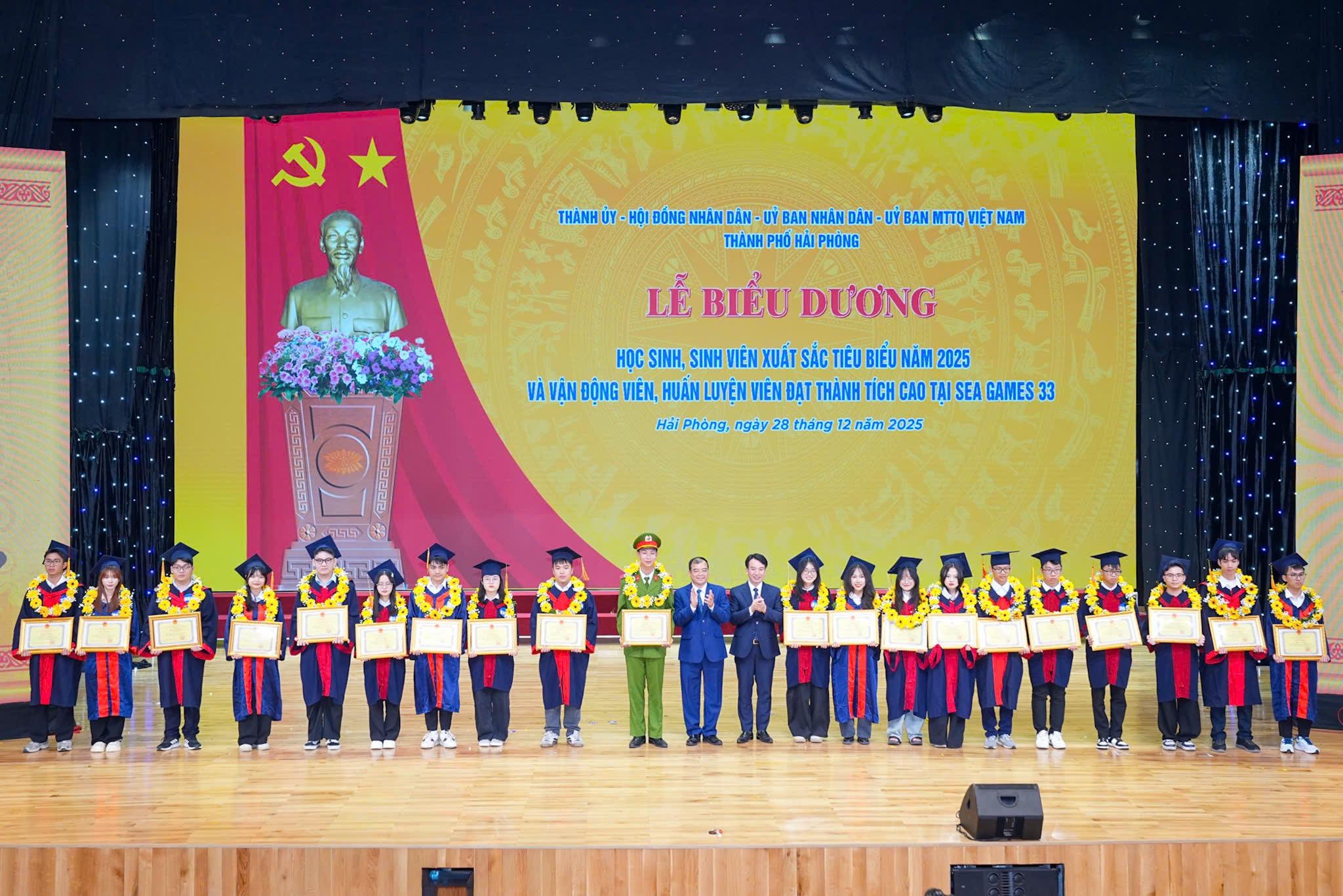(Haiphong.gov.vn) - Tối 28/12, tại Trung tâm Hội nghị - Biểu diễn thành phố, UBND thành phố tổ chức Lễ biểu dương Học sinh, sinh viên xuất sắc tiêu biểu năm 2025 và vận động viên, huấn luyện viên đạt thành tích cao tại SEA Game 33.