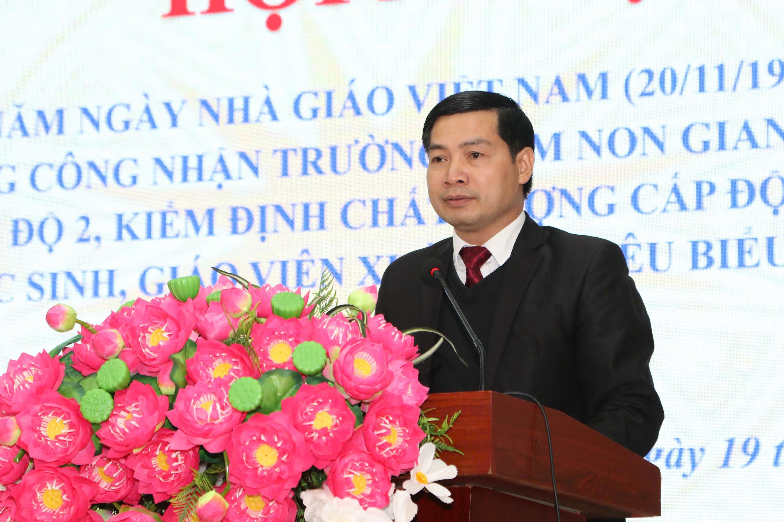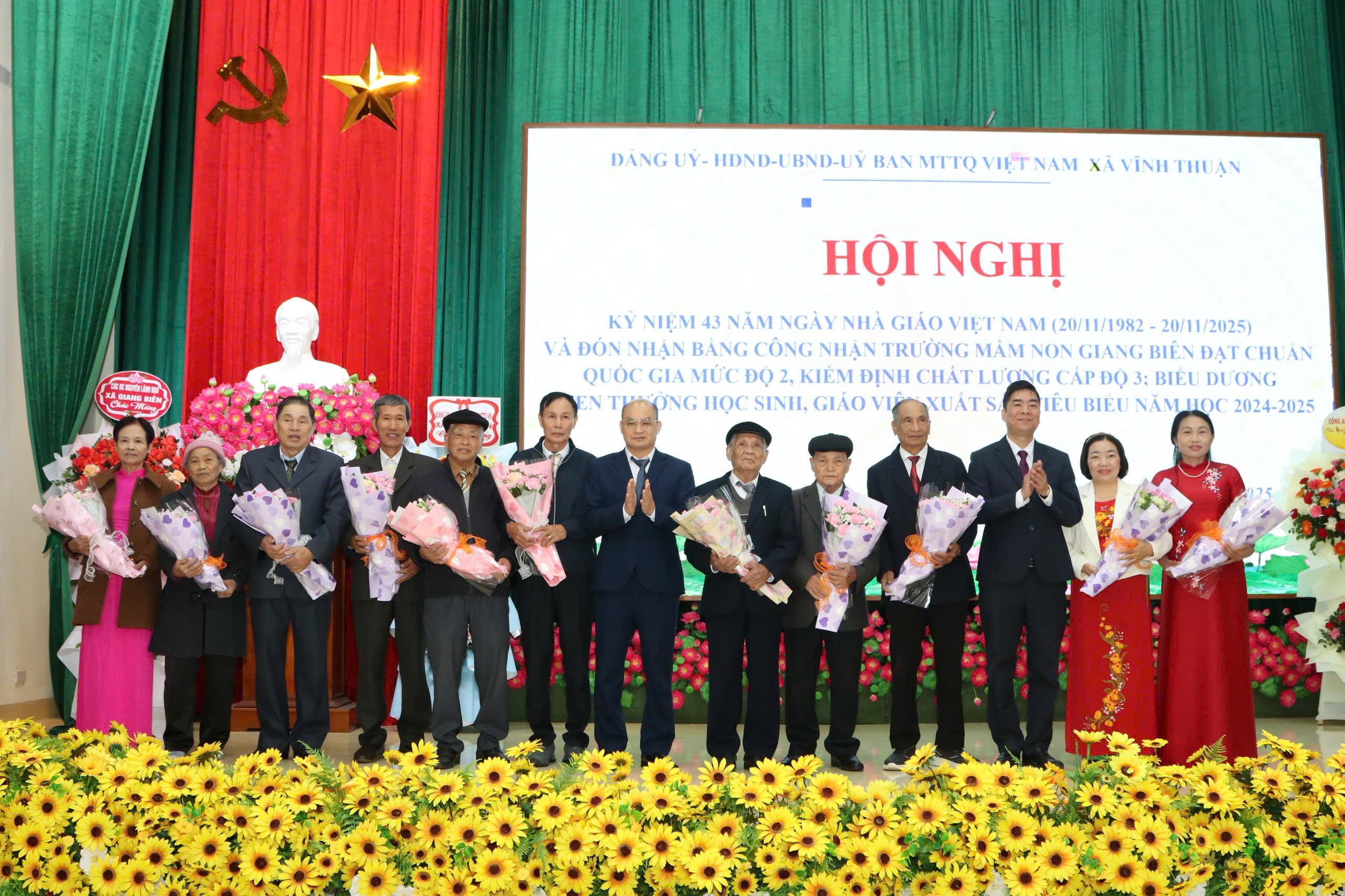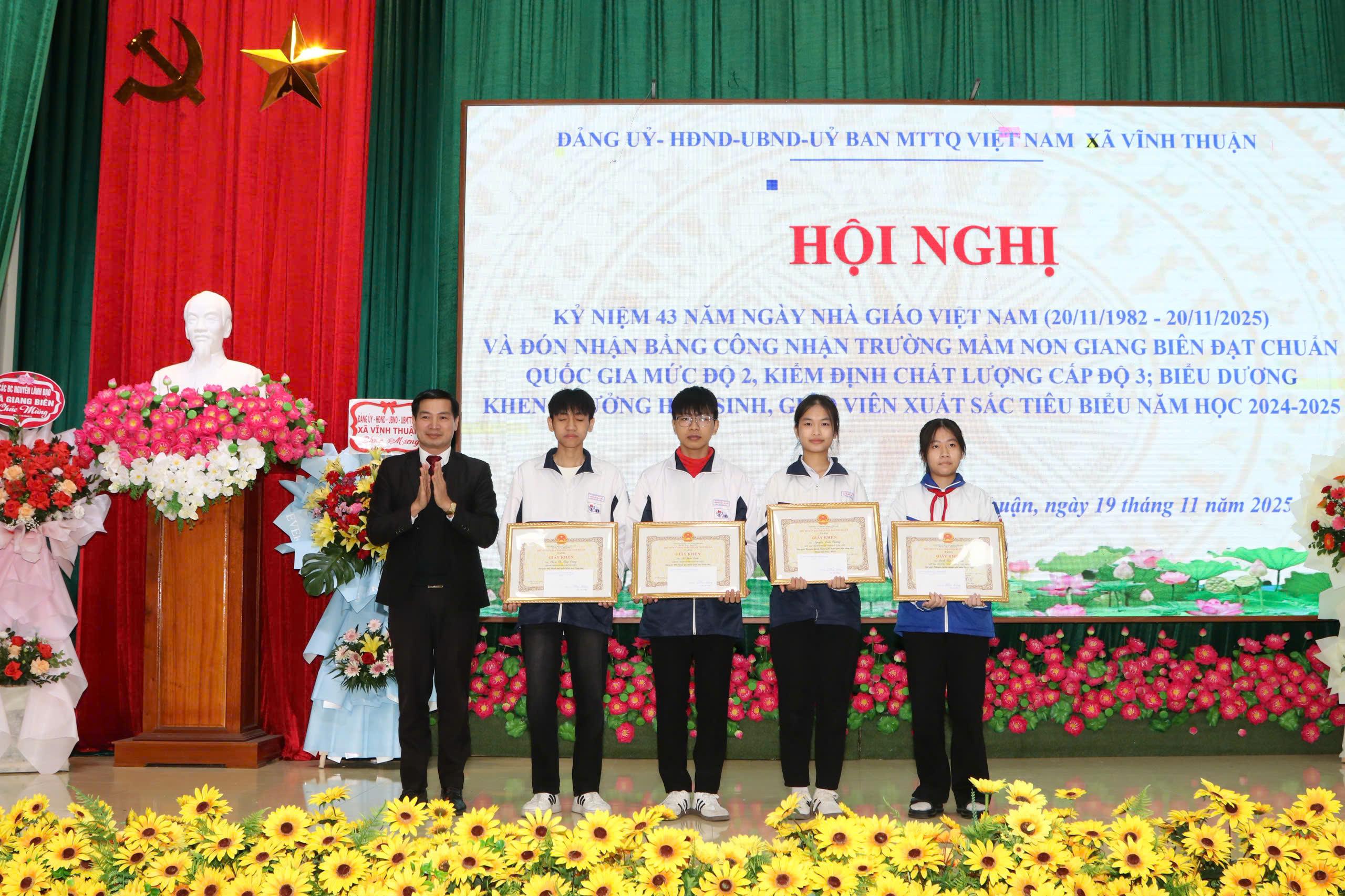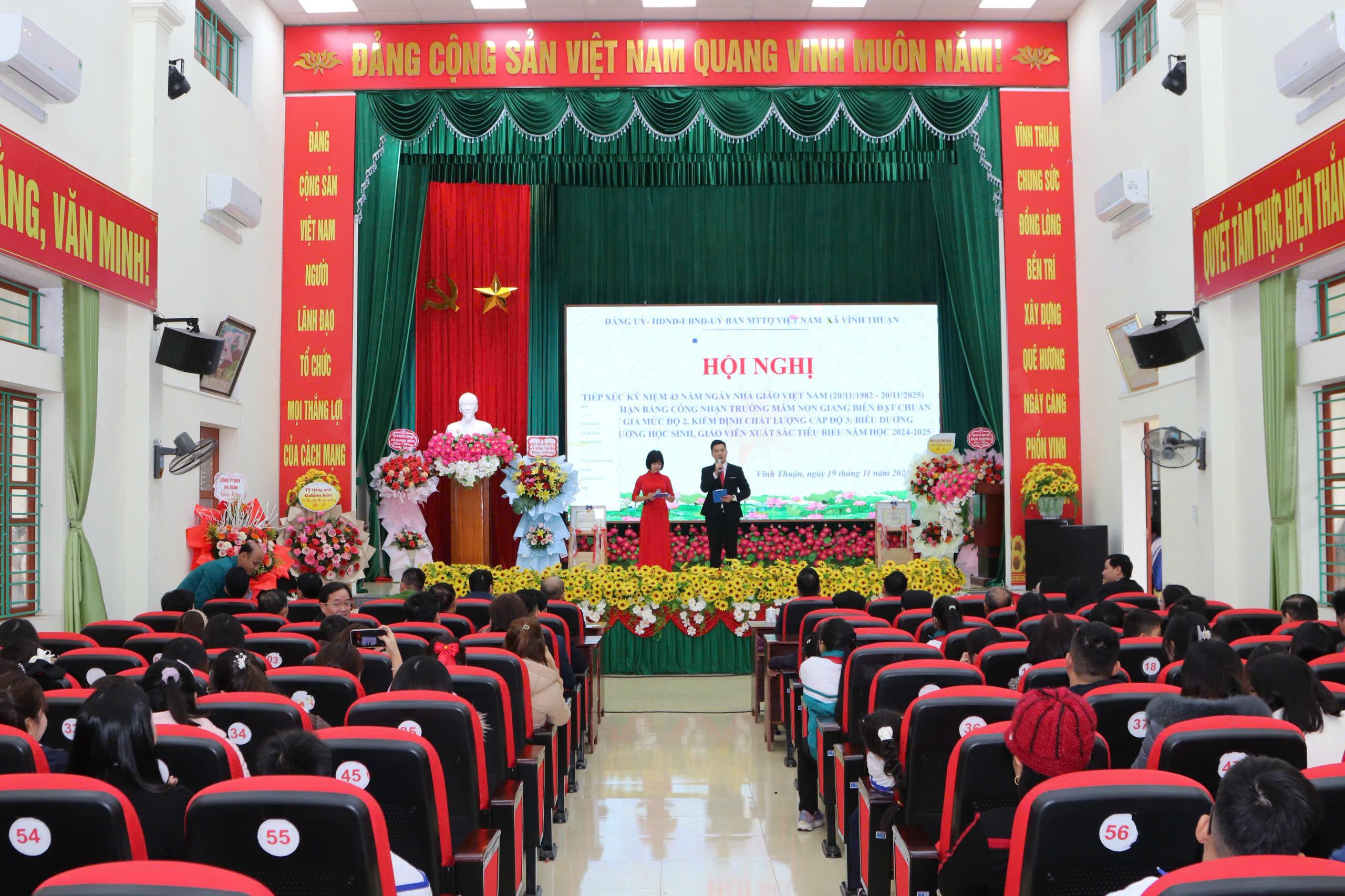 Phát biểu tại Lễ Kỷ niệm, Phó Chủ tịch Thường trực UBND xã Vĩnh Thuận – Đoàn Đức Giang đã ôn lại lịch sử ra đời Ngày Nhà giáo Việt Nam và nhìn lại chặng đường cống hiến của ngành giáo dục trong 43 năm qua. Trong bối cảnh yêu cầu đổi mới giáo dục ngày càng cao, đội ngũ giáo viên xã Vĩnh Thuận luôn nỗ lực đổi mới phương pháp giảng dạy, tăng cường ứng dụng công nghệ thông tin, triển khai chương trình giáo dục phổ thông mới, hướng tới xây dựng môi trường học tập hiện đại và bền vững. Lãnh đạo xã bày tỏ lòng tri ân đối với những đóng góp của đội ngũ giáo viên; đồng thời đề nghị các nhà trường tiếp tục đổi mới tư duy, nâng cao chất lượng chuyên môn, đẩy mạnh chuyển đổi số và xây dựng môi trường giáo dục nhân văn, sáng tạo.