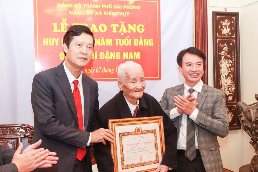 Dịp này, Đảng bộ xã Kiến Thụy có 28 đảng viên được trao tặng Huy hiệu Đảng. Trong đó, đồng chí Đặng Nam, đảng viên Chi bộ thôn Cẩm Xuân vinh dự được trao tặng Huy hiệu 80 năm tuổi Đảng.