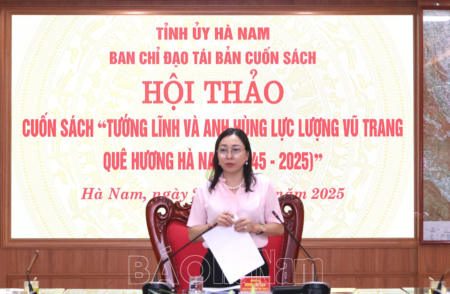 Phát biểu tại hội thảo, đồng chí Đinh Thị Lụa, Phó Bí thư Thường trực Tỉnh uỷ, Phó Trưởng BCĐ biên soạn tái bản cuốn sách ghi nhận sự nỗ lực cố gắng của các đồng chí trong BCĐ đã tích cực sưu tầm tư liệu, hoàn thiện bản thảo trong thời gian ngắn (khoảng hơn 2 tháng). Bản thảo cuốn sách và các ý kiến tham luận tại hội thảo đã thể hiện đầy đủ, làm sáng rõ hơn về mảnh đất Hà Nam nghìn năm văn hiến, có bề dày lịch sử truyền thống yêu nước, đấu tranh cách mạng. Đặc biệt, cuốn sách đã khắc họa chân dung thành tích, sự cống hiến của các tướng lĩnh và Anh hùng LLVT nhân dân, những người con ưu tú của quê hương Hà Nam giai đoạn 1945 - 2025; một số thành tựu và hình ảnh của quê hương Hà Nam ngày nay. Trên cơ sở đó xây dựng, bồi đắp tình yêu quê hương đất nước, lòng tự hào cho các thế hệ cán bộ, đảng viên, nhân dân và LLVT tỉnh. Đồng chí Phó Bí thư Thường trực Tỉnh ủy nhấn mạnh: Đây là đề tài cấp tỉnh, được nghiên cứu tái bản và bổ sung các tướng lĩnh, Anh hùng LLVT nhân dân được phong tặng và truy tặng. Đồng chí Phó Bí thư Thường trực Tỉnh ủy đề nghị: Thời gian từ nay đến khi sáp nhập tỉnh không còn nhiều, các thành viên trong BCĐ, Ban biên soạn, Tổ sưu tầm tiếp thu đầy đủ ý kiến của các đại biểu, tiếp tục bổ sung, biên soạn, hoàn chỉnh và xuất bản cuốn sách đúng tiến độ, thời gian theo kế hoạch, phục vụ kịp thời cho việc tuyên truyền trong Đảng bộ, nhân dân và LLVT tỉnh.