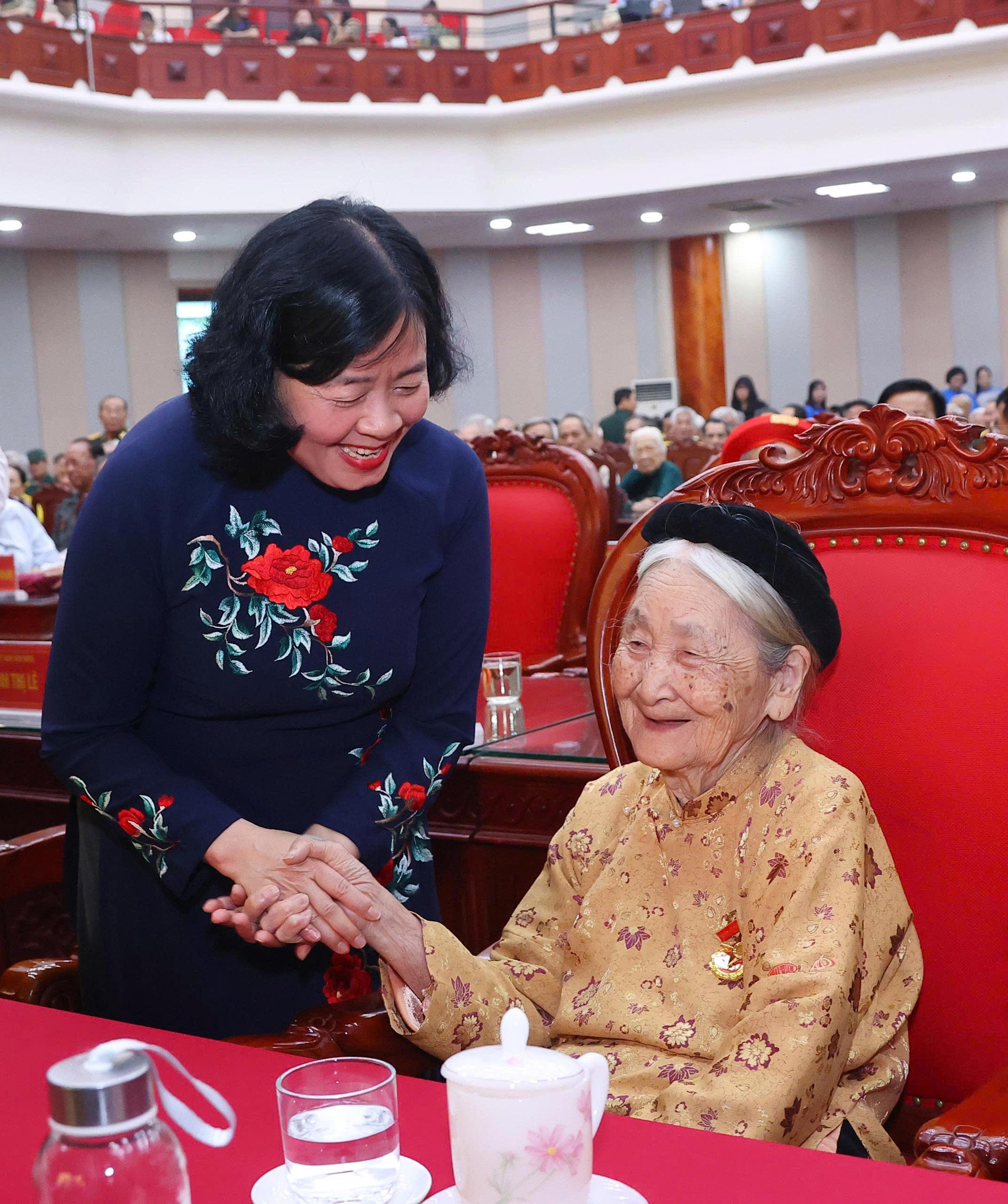 Uỷ viên Bộ chính trị, Bí thư Thành ủy Hà Nội Bùi Thị Minh Hoài với đại biểu Bà mẹ Việt Nam Anh hùng