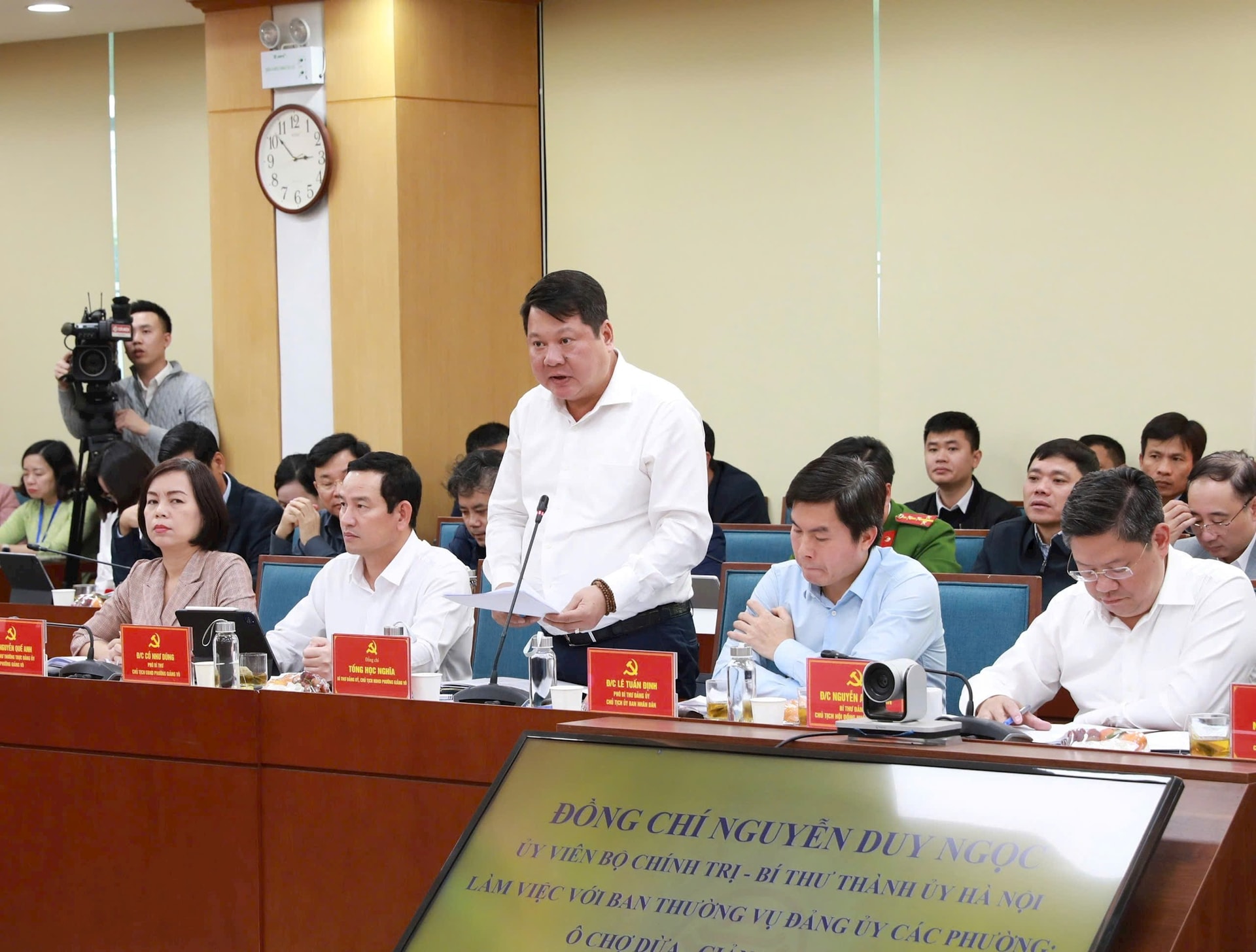 Sau khi nghe các ý kiến phát biểu của các đồng chí lãnh đạo thành phố, các sở, ngành và 3 phường, phát biểu kết luận cuộc làm việc, Bí thư Thành ủy Hà Nội Nguyễn Duy Ngọc đánh giá cao những kết quả về công tác xây dựng Đảng, phát triển kinh tế - xã hội, đảm bảo quốc phòng, an ninh các phường đạt được trong thời gian qua.