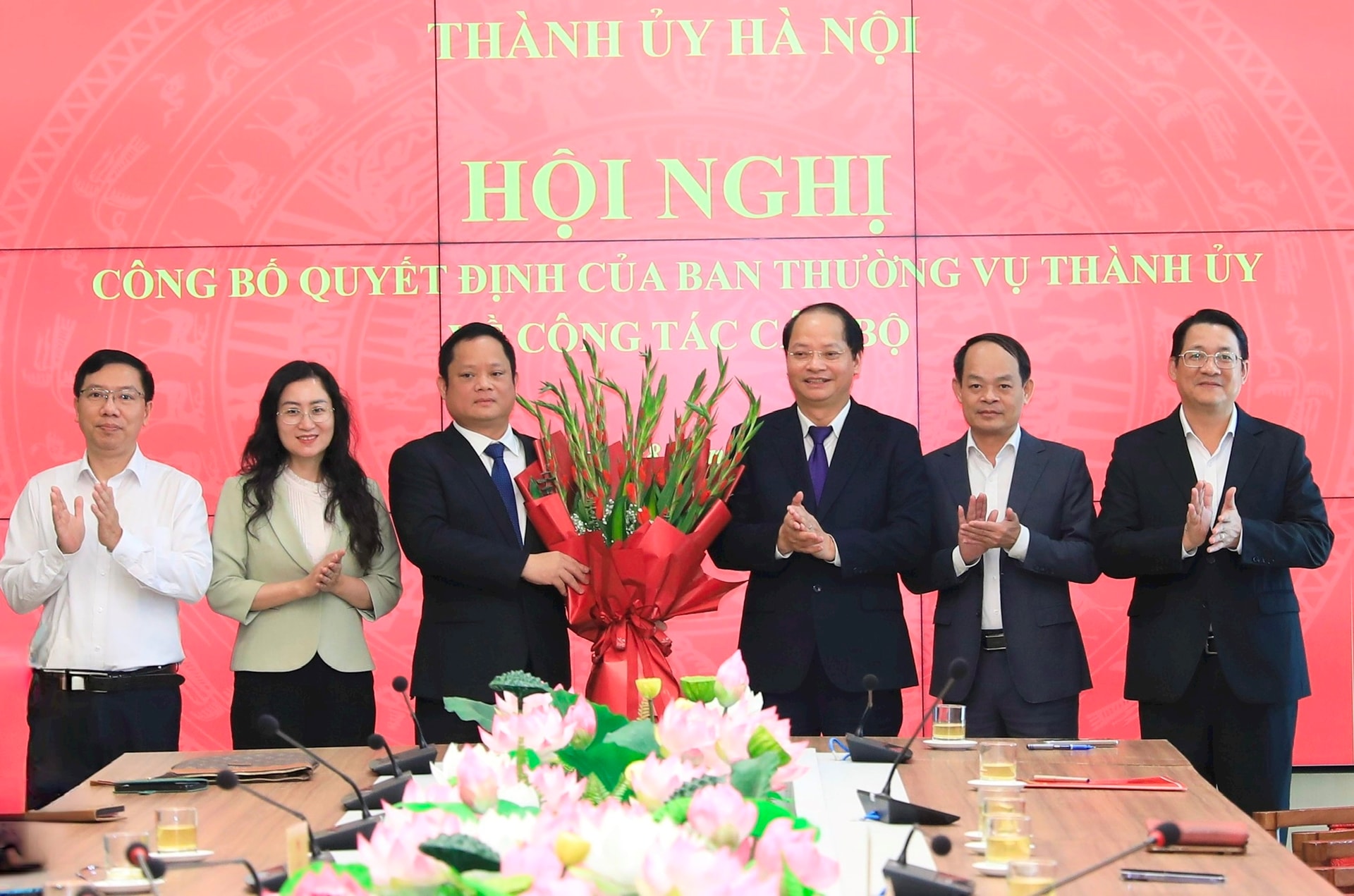 Phó Bí thư Thường trực Thành ủy Hà Nội Nguyễn Văn Phong trao quyết định của Ban Thường vụ Thành ủy Hà Nội và tặng hoa chúc mừng đồng chí Vũ Minh Tuấn