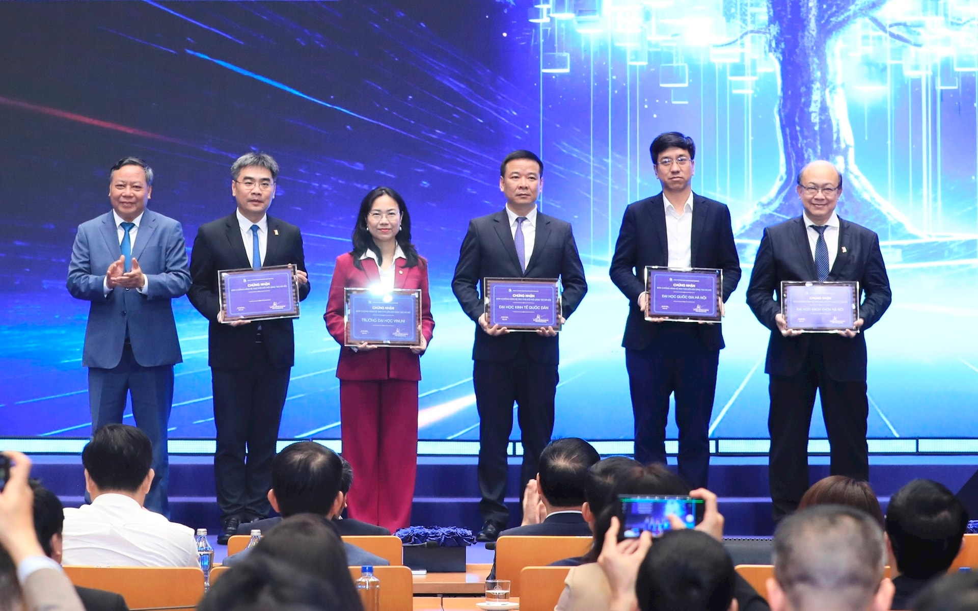 Bộ trưởng Bộ Khoa học và Công nghệ Nguyễn Mạnh Hùng trao chứng nhận cho các đơn vị đồng hành cùng Trung tâm Đổi mới sáng tạo Hà Nội. Ảnh: Quang Thái