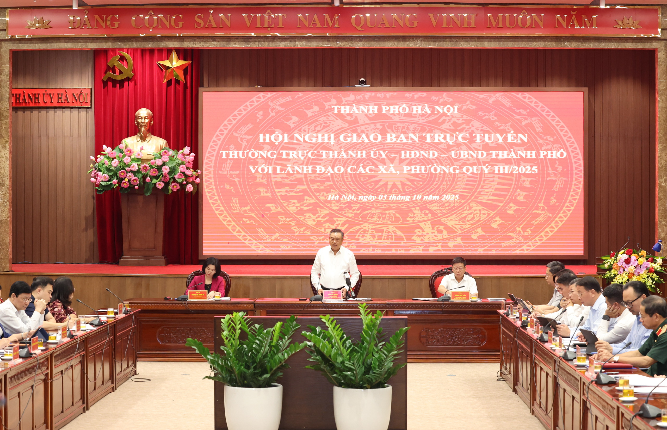 Ngày 03-10, Thường trực Thành ủy, HĐND, UBND thành phố Hà Nội tổ chức Hội nghị giao ban trực tuyến quý III-2025 với lãnh đạo 126 xã, phường nhằm tháo gỡ vướng mắc trong vận hành mô hình chính quyền địa phương 2 cấp.