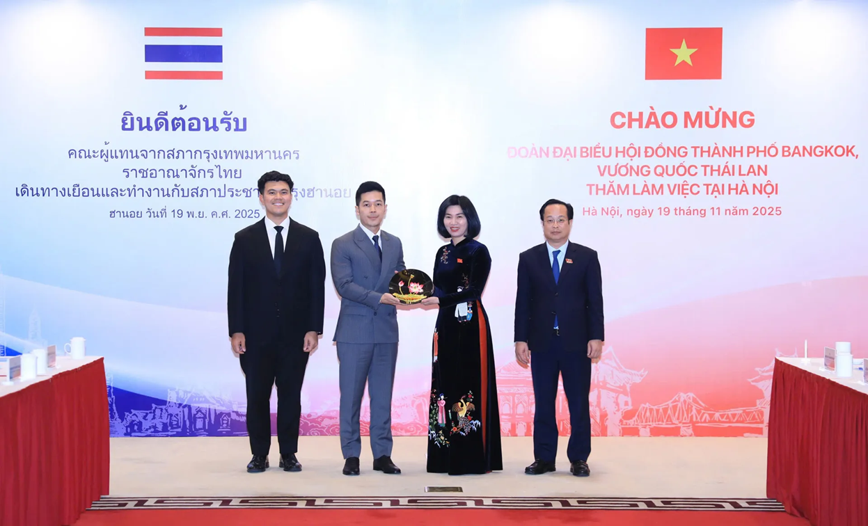 "Với nền tảng hợp tác bền chặt, thành phố Hà Nội mong muốn tiếp tục mở rộng trao đổi với Thủ đô Bangkok trong các lĩnh vực như: quản lý đô thị, du lịch, giáo dục, văn hóa, môi trường; kết nối doanh nghiệp, góp phần thúc đẩy quan hệ Đối tác chiến lược toàn diện Việt Nam - Thái Lan" - Chủ tịch HĐND thành phố Hà Nội Phùng Thị Hồng Hà bày tỏ.