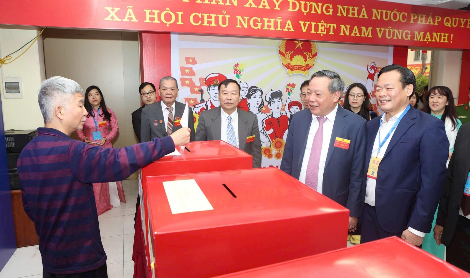 Phó Bí thư Thành ủy Hà Nội Nguyễn Văn Phong kiểm tra công tác bầu cử tại khu vực bỏ phiếu số 13, phường Hồng Hà. Ảnh: Thanh Hải