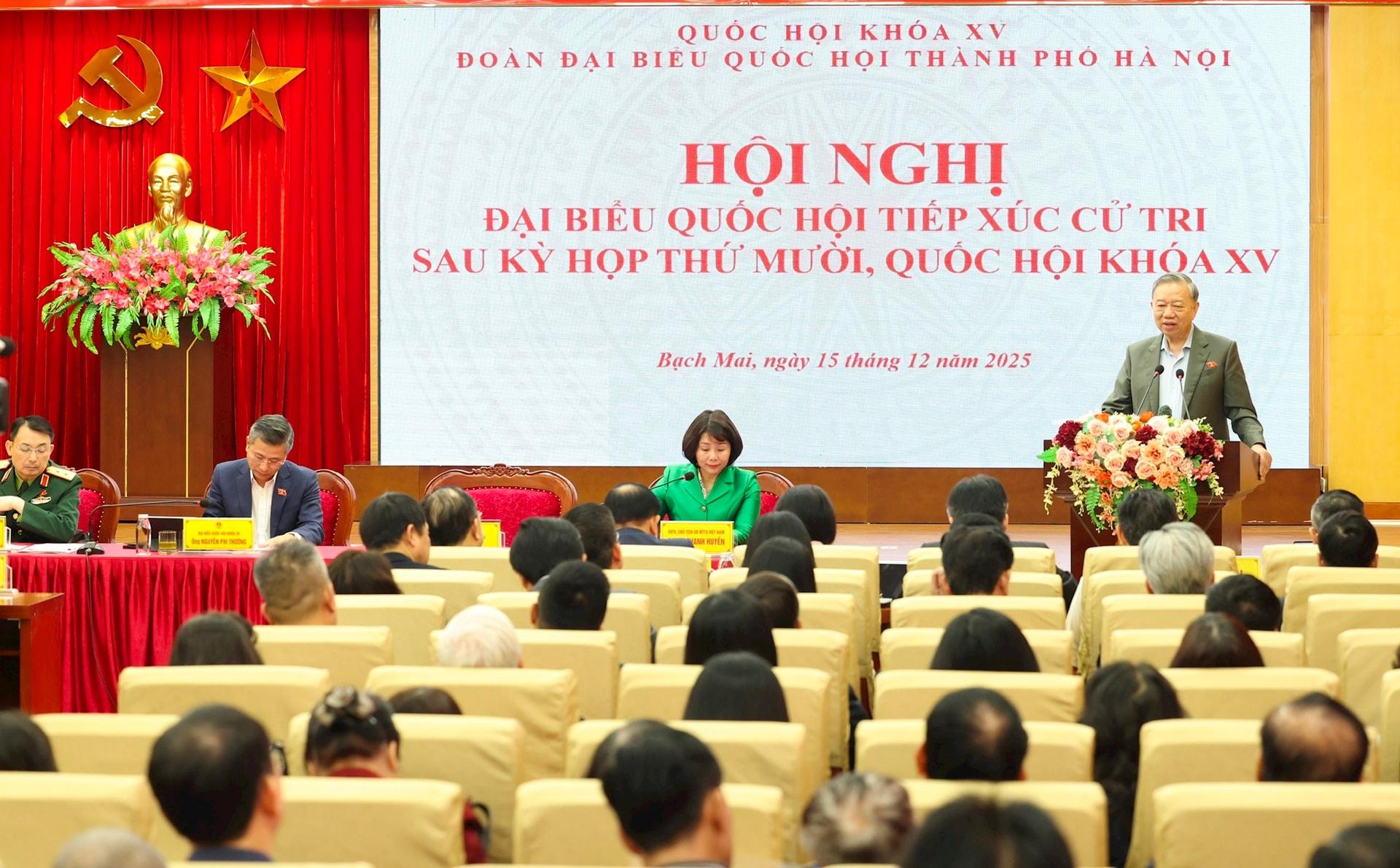 Ngày 15-12, tại trụ sở phường Bạch Mai, Tổng Bí thư Tô Lâm cùng các đại biểu Quốc hội đã tiếp xúc cử tri Đơn vị bầu cử số 1, thành phố Hà Nội báo cáo kết quả kỳ họp thứ mười, Quốc hội khóa XV.