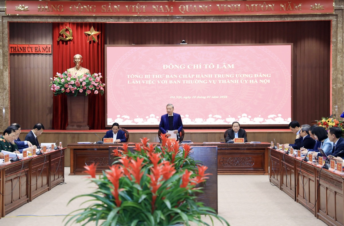 Nội dung Thông báo nêu rõ, ngày 10-01-2026, đồng chí Tô Lâm, Tổng Bí thư Ban Chấp hành Trung ương Đảng cùng các đồng chí lãnh đạo Đảng, Nhà nước đã thăm và làm việc với Ban Thường vụ Thành ủy Hà Nội về việc xây dựng Quy hoạch Thủ đô tầm nhìn 100 năm gắn với hoàn thiện thể chế đáp ứng yêu cầu phát triển; dự kiến mô hình phát triển kinh tế - xã hội và thực hiện mục tiêu tăng trưởng 2 con số. Tham dự làm việc với đồng chí Tổng Bí thư có đồng chí Phạm Minh Chính, Ủy viên Bộ Chính trị, Thủ tướng Chính phủ nước CHXHCN Việt Nam; đồng chí Trần Thanh Mẫn, Ủy viên Bộ Chính trị, Chủ tịch Quốc hội nước CHXHCN Việt Nam; đồng chí Lương Tam Quang, Ủy viên Bộ Chính trị, Bộ trưởng Bộ Công an; các đồng chí đại diện lãnh đạo: Văn phòng Trung ương Đảng, Văn phòng Quốc hội, Văn phòng Tổng Bí thư; Ban Chính sách và Chiến lược Trung ương; Ủy ban Pháp luật và Tư pháp, Ủy ban Kinh tế - Tài chính của Quốc hội; các Bộ, ngành: Quốc phòng, Tư pháp, Tài chính, Xây dựng; đại diện Thường trực thành ủy: Thành phố Hồ Chí Minh, Hải Phòng, Cần Thơ, Đà Nẵng, Huế; các đồng chí trợ lý, thư ký của các đồng chí Lãnh đạo Đảng, Nhà nước.