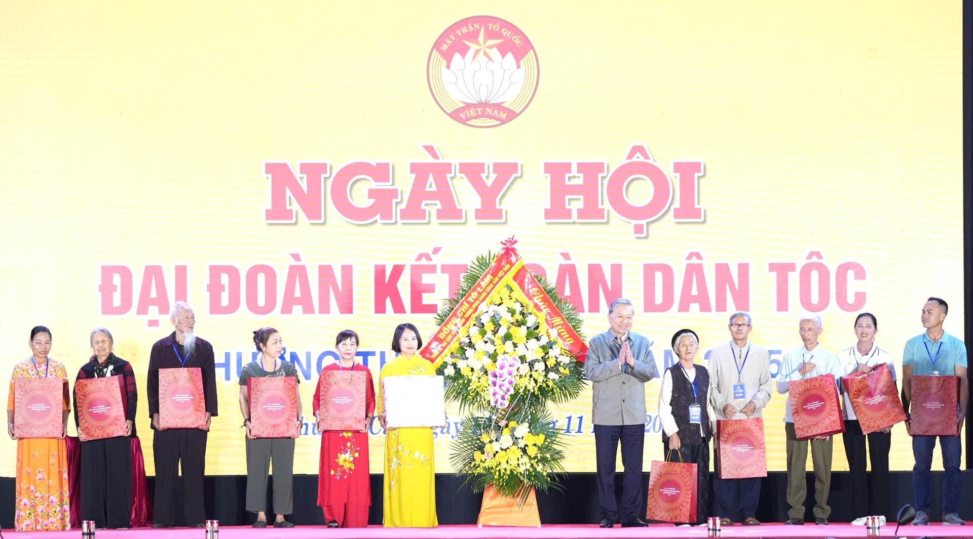 Phát biểu tại ngày hội, Tổng Bí thư Tô Lâm cho biết, trong không khí ấm áp của Ngày hội Đại đoàn kết toàn dân tộc, chúng ta cùng nhau khẳng định lại một chân lý giản dị mà vĩnh hằng: Đại đoàn kết toàn dân tộc là truyền thống, là tài sản, là di sản vô giá của cha ông, là sức mạnh làm nên mọi thắng lợi, mọi thành tựu của dân tộc ta, đất nước ta. Chủ tịch Hồ Chí Minh đã căn dặn: "Đoàn kết, đoàn kết, đại đoàn kết; thành công, thành công, đại thành công". Đó là chân lý, là phương châm hành động, là mệnh lệnh từ trái tim của dân tộc, của hồn thiêng sông núi, của Tổ quốc gửi đến từng người trong chúng ta.