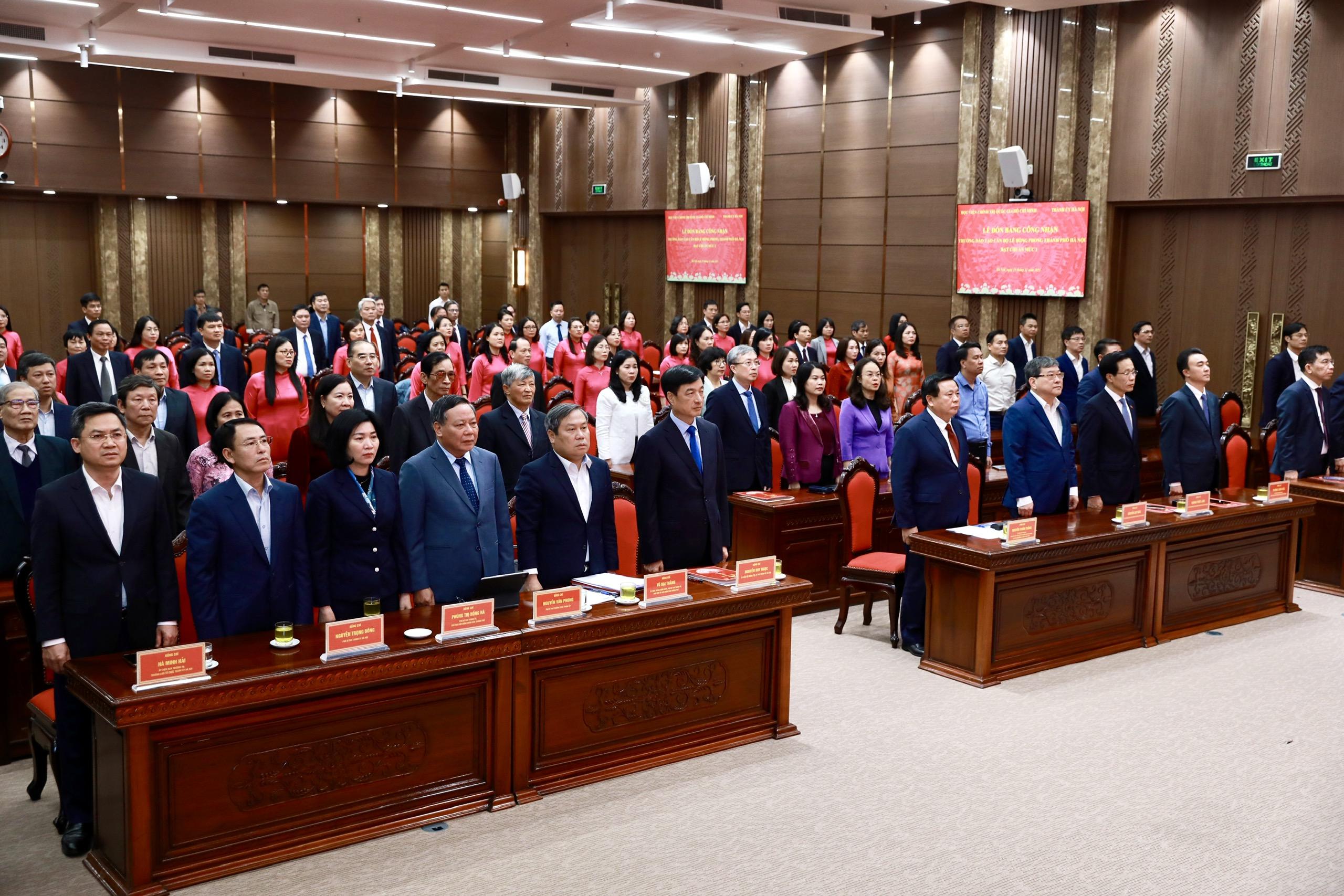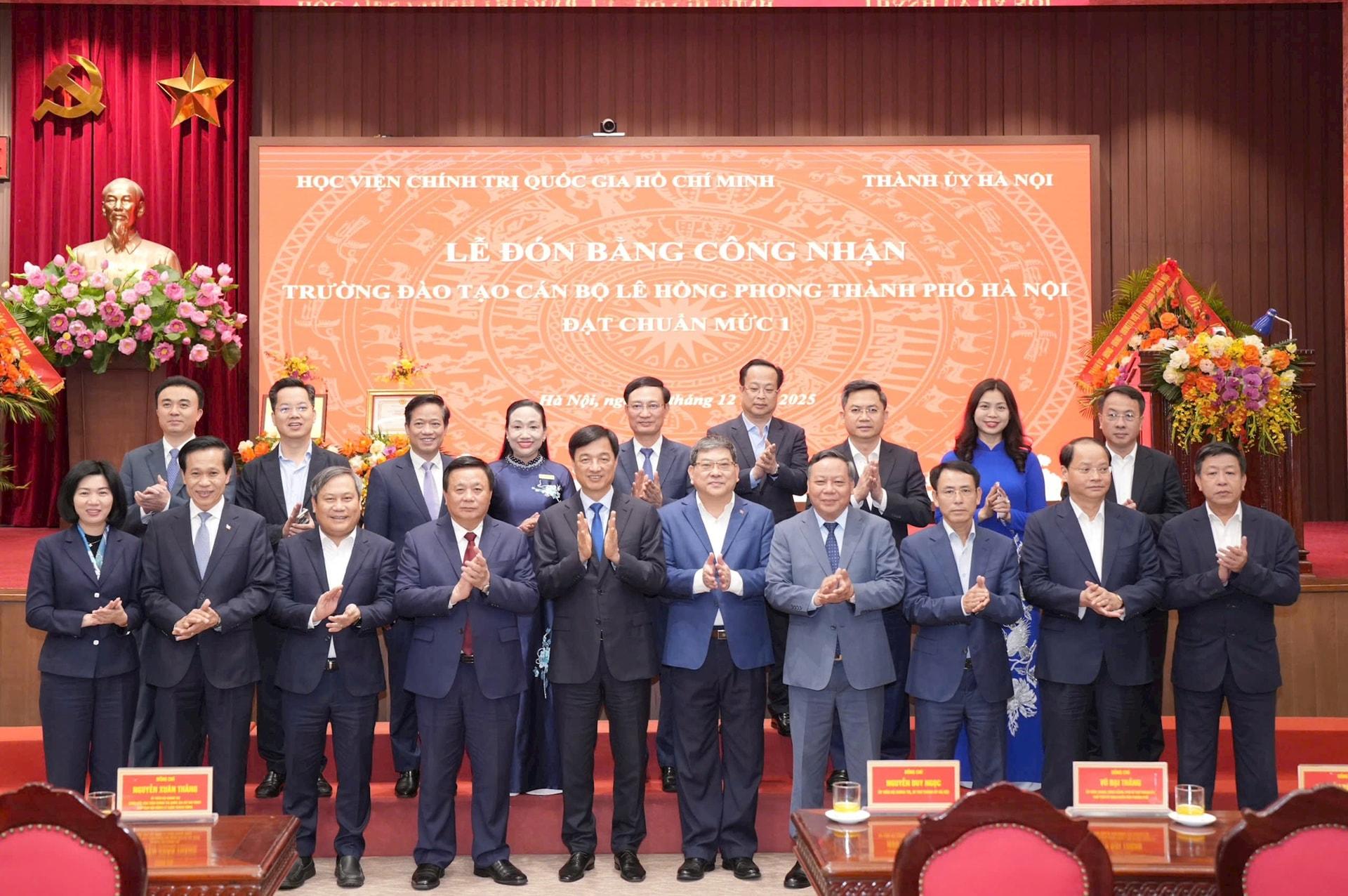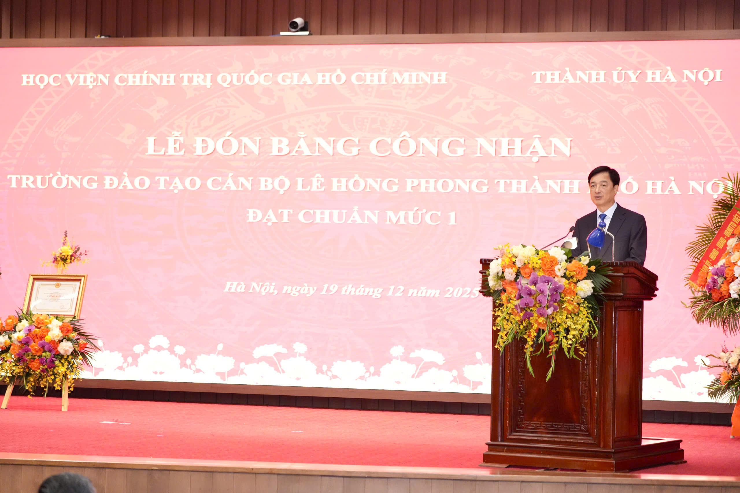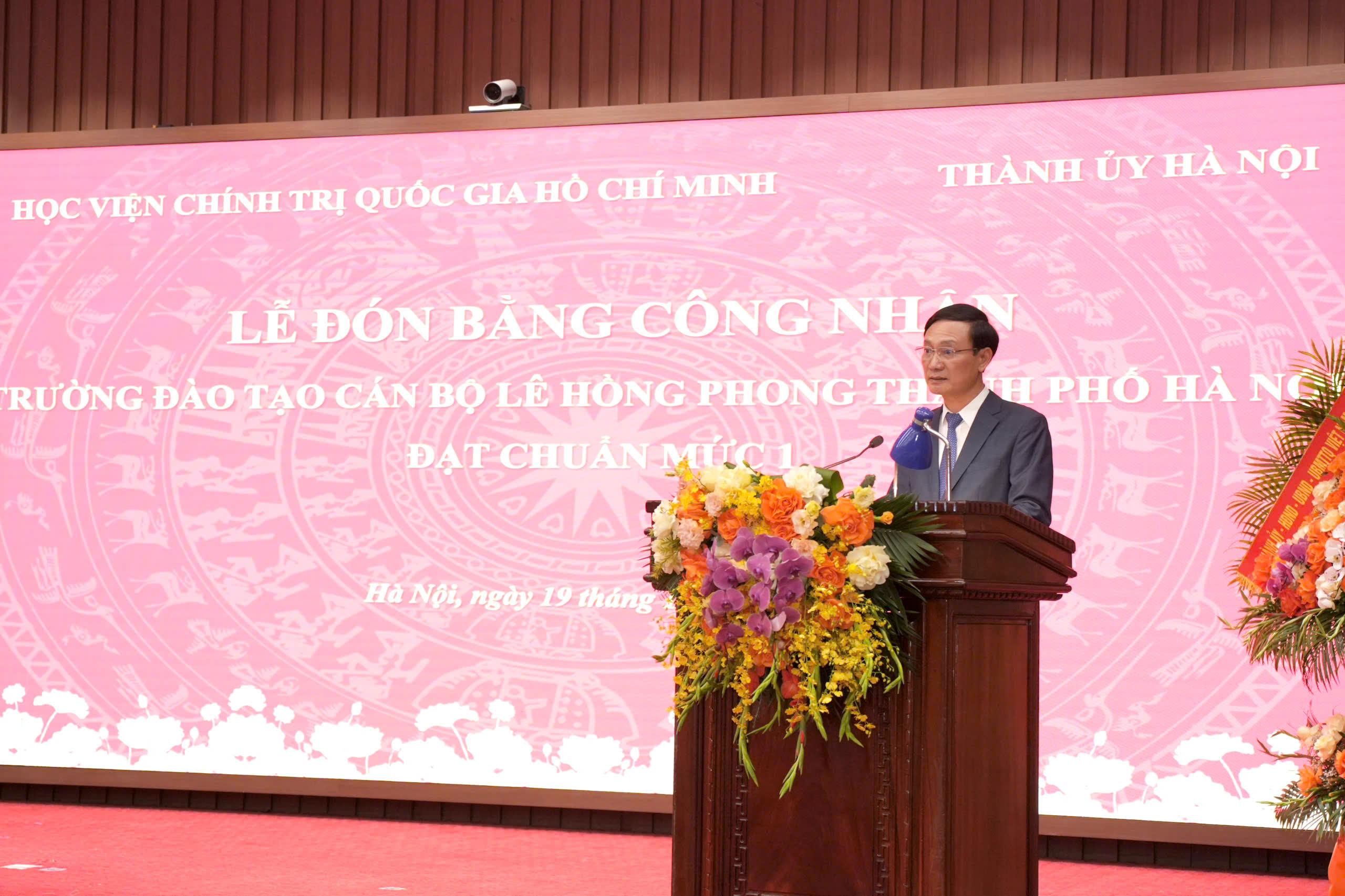 Phát biểu tại buổi lễ, GS.TS Nguyễn Xuân Thắng, Giám đốc Học viện Chính trị quốc gia Hồ Chí Minh, Chủ tịch Hội đồng Lý luận Trung ương đánh giá cao vai trò lãnh đạo, chỉ đạo sâu sát của Ban Thường vụ Thành ủy, sự nỗ lực của đội ngũ cán bộ, giảng viên, viên chức, người lao động Nhà trường trong quá trình đầu tư nâng cao chất lượng Trường Đào tạo cán bộ Lê Hồng Phong đạt chuẩn mức 1. Theo đồng chí Nguyễn Xuân Thắng, quá trình đánh giá, thẩm định để đi tới công nhận Trường đạt chuẩn mức 1 được thực hiện rất nghiêm túc, chặt chẽ với tinh thần không nợ tiêu chí. Kết quả đạt được hôm nay là một quá trình xây dựng kế hoạch, tổ chức thực hiện một cách bài bản, nhất là trong xây dựng đội ngũ cán bộ, giảng viên. Từ chỗ Nhà trường không có giảng viên có học vị tiến sĩ nào, chỉ có duy nhất một đồng chí tuyển từ nơi khác về, đến nay Trường đã có 17 tiến sĩ, chiếm 24%, là tỷ lệ cao nhất cả nước.