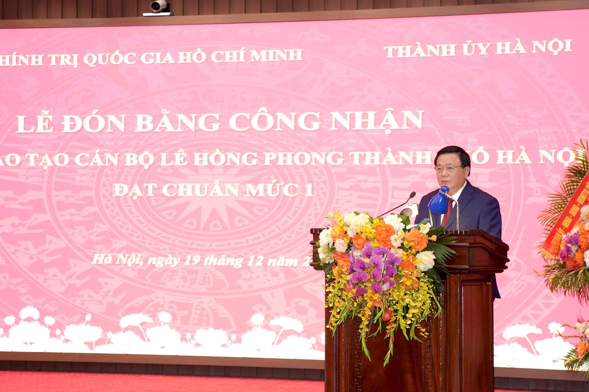 Ủy viên Bộ Chính trị, Bí thư Thành ủy Hà Nội Nguyễn Duy Ngọc tặng hoa chúc mừng Trường Đào tạo cán bộ Lê Hồng Phong.